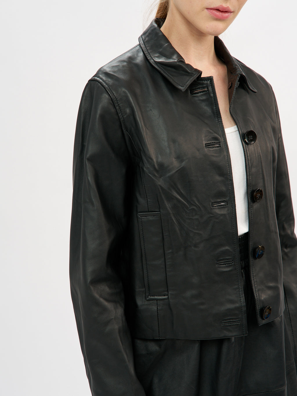 הגזרה הקצרה והנקייה מחמיאה לקווי הגוף ויוצרת איזון מושלם בין קלאסי לעכשווי, עם צווארון קטן וסגירת כפתורים קדמית בגימור מוקפד