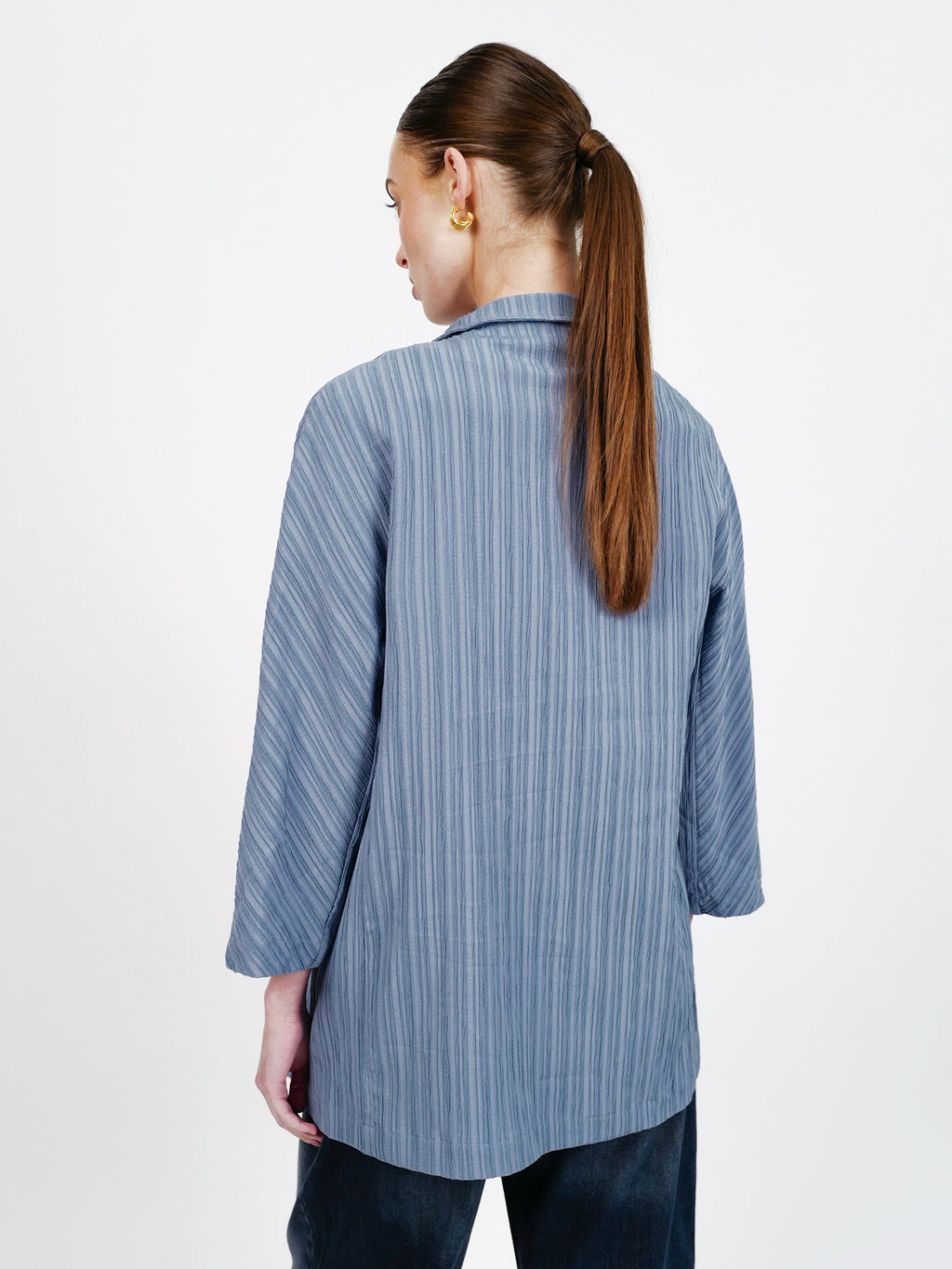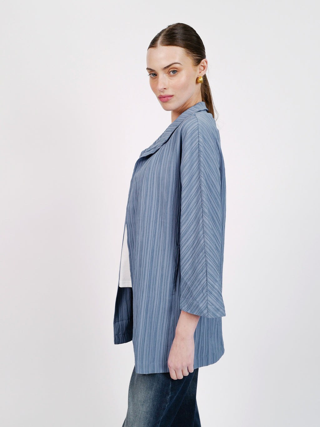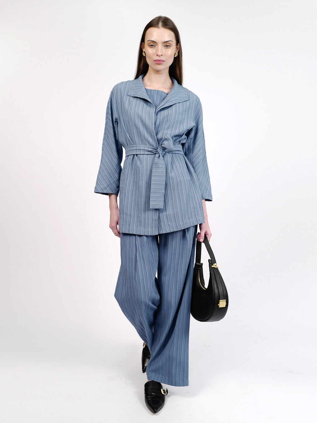 ז׳קט מקס הוא פריט שכבות קליל ומחמיא בגזרה נינוחה, עם טקסטורת פסים עדינה שמעניקה עומק ושיק. הבד רך, נשפך ונעים על הגוף, כך שאפשר ללבוש אותו פתוח למראה רפוי-אלגנטי או לסגור למראה מהודק יותר. מושלם לאביב ולערבים קרירים, וגם כפריט אידיאלי לטיסה - מתקפל בקלות, כמעט לא תופס מקום במזוודה, ותמיד מציל מול מזגן במטוס או ערב אירופאי קריר. הז׳קט מגיע בצבעים תכלת ושחור, ומשתלב נהדר כסט עם מכנסי רומיאו וחולצת ג׳ורג׳ינה.