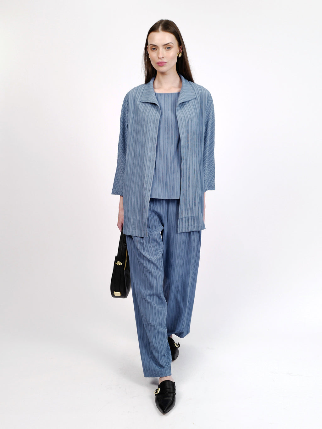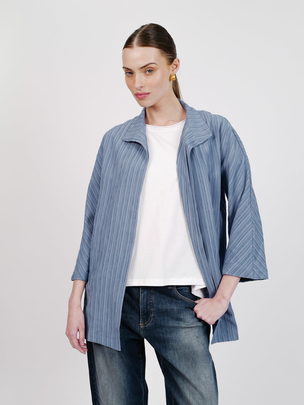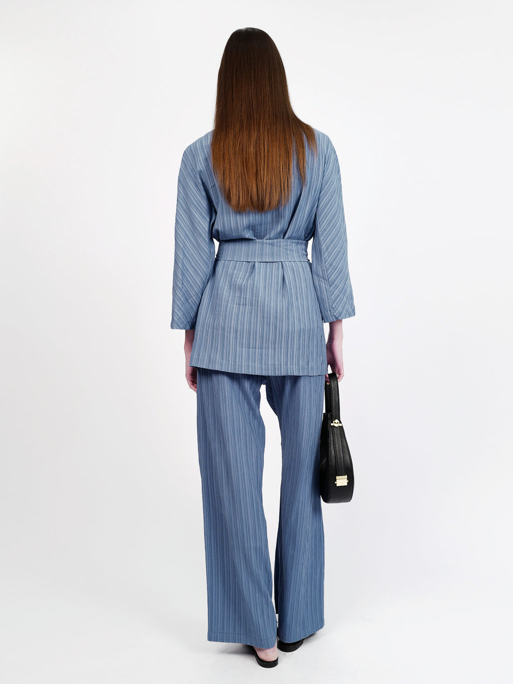 ז׳קט מקס הוא פריט שכבות קליל ומחמיא בגזרה נינוחה, עם טקסטורת פסים עדינה שמעניקה עומק ושיק. הבד רך, נשפך ונעים על הגוף, כך שאפשר ללבוש אותו פתוח למראה רפוי-אלגנטי או לסגור למראה מהודק יותר. מושלם לאביב ולערבים קרירים, וגם כפריט אידיאלי לטיסה - מתקפל בקלות, כמעט לא תופס מקום במזוודה, ותמיד מציל מול מזגן במטוס או ערב אירופאי קריר. הז׳קט מגיע בצבעים תכלת ושחור, ומשתלב נהדר כסט עם מכנסי רומיאו וחולצת ג׳ורג׳ינה.