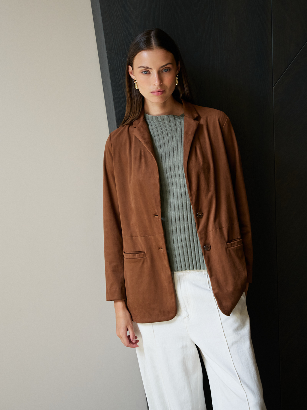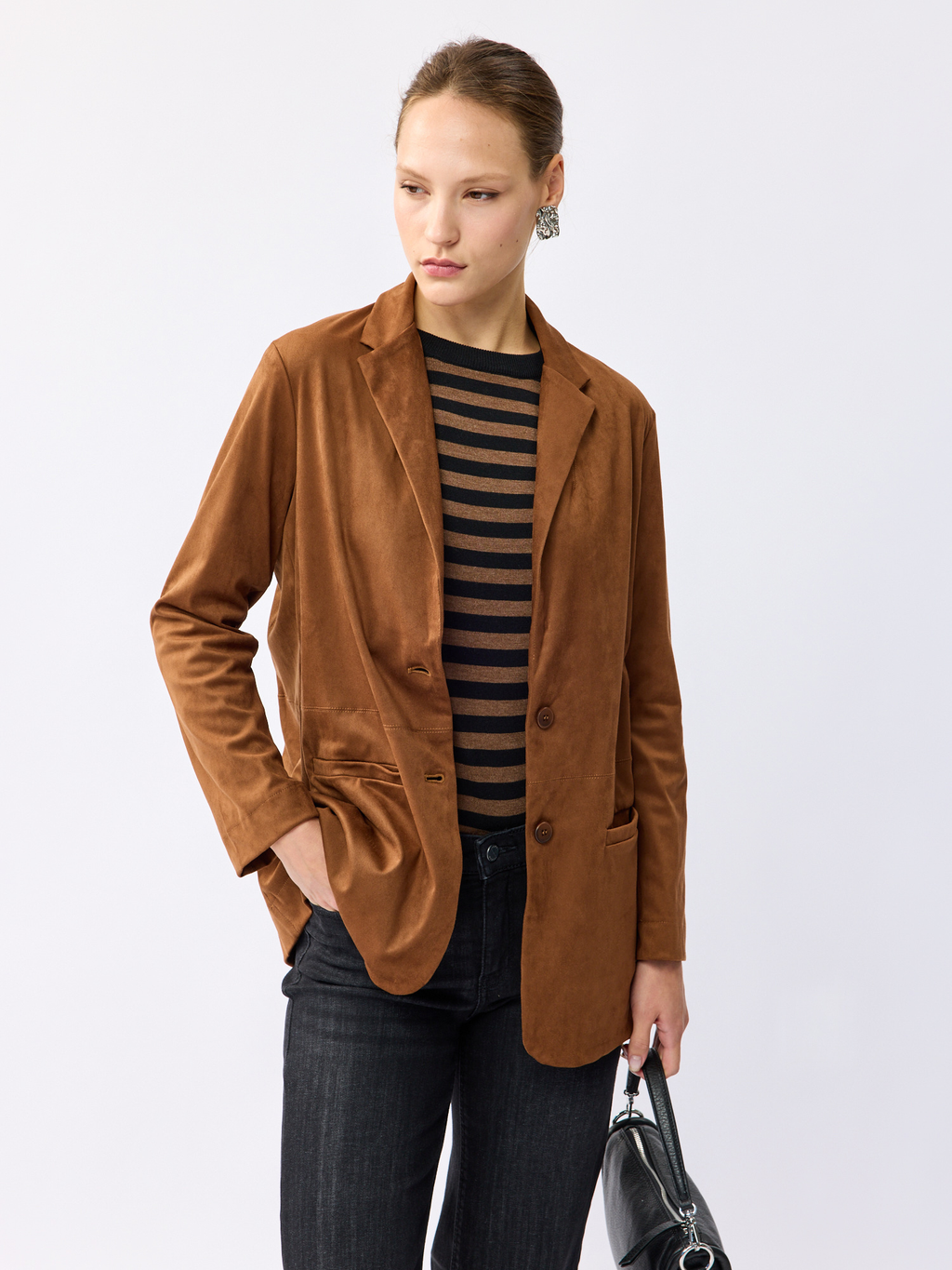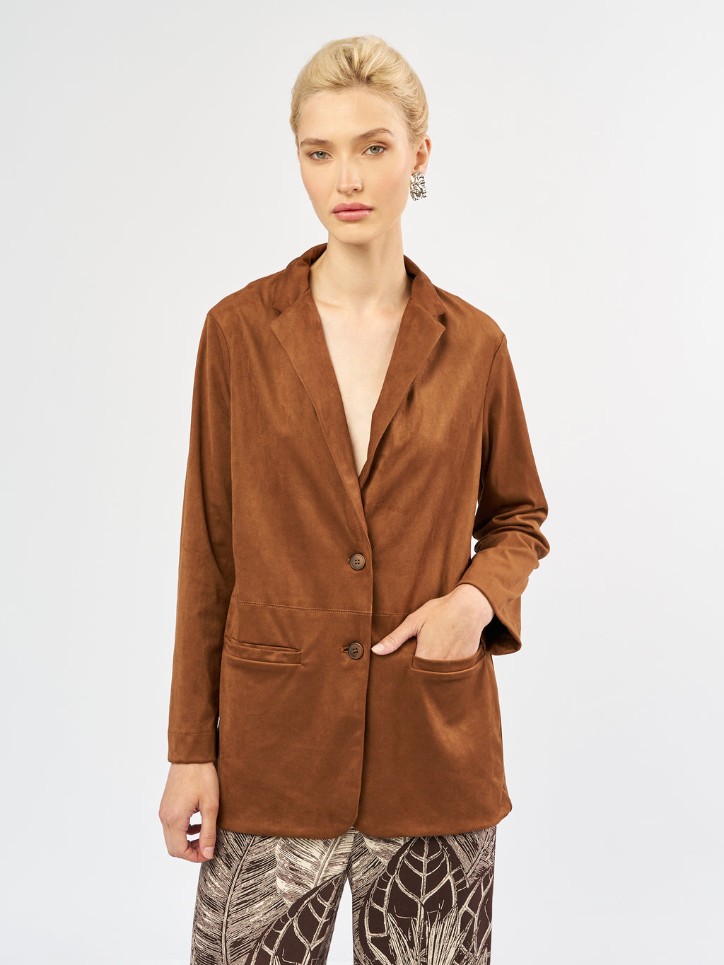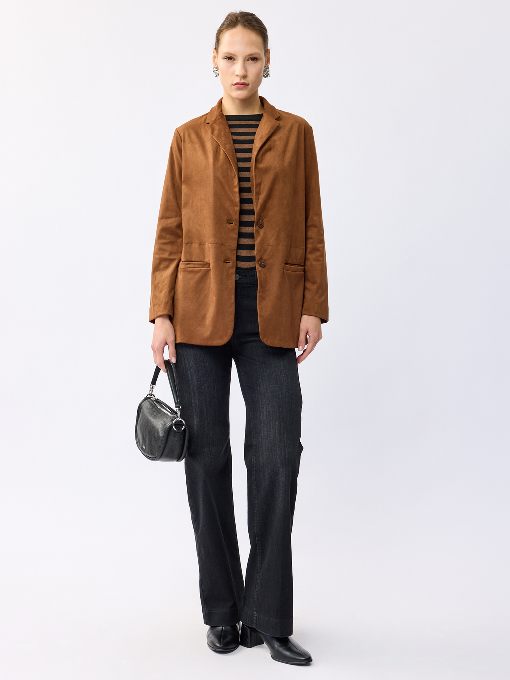 ז'קט פרנצ'סקה הוא פריט אלגנטי ומעודן בגזרה מחויטת קלה, עשוי בד במרקם זמש רך ונעים למגע המעניק לו מראה עשיר ומלטף מגיע עם שני כפתורים בחזית, צווארון מחודד וכיסי צד המוסיפים פונקציונליות וסגנון השרוולים הארוכים והגזרה הישרה יוצרים מראה נקי ומודרני, אידיאלי לשילוב מעל שמלה או עם מכנסיים מחוייטים ללוק עסקי, וגם עם ג'ינס לשיק יומיומי