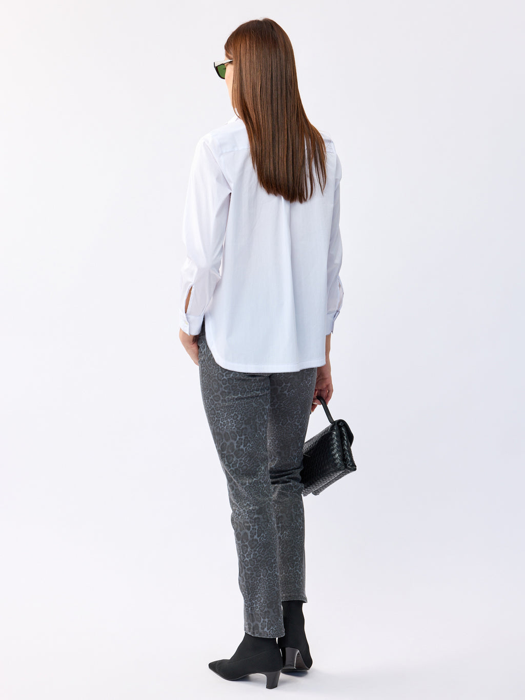 החולצה מתאפיינת בצווארון מחויט, שרוולים ארוכים עם חפתים רחבים, וסגירת כפתורים נסתרת המעניקה מראה נקי ומעודן