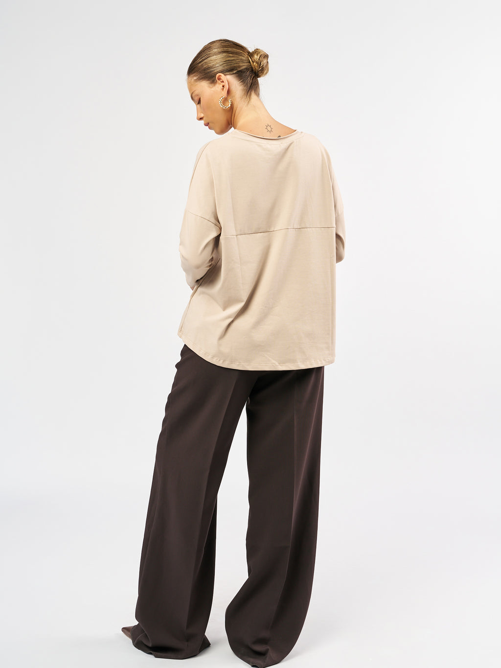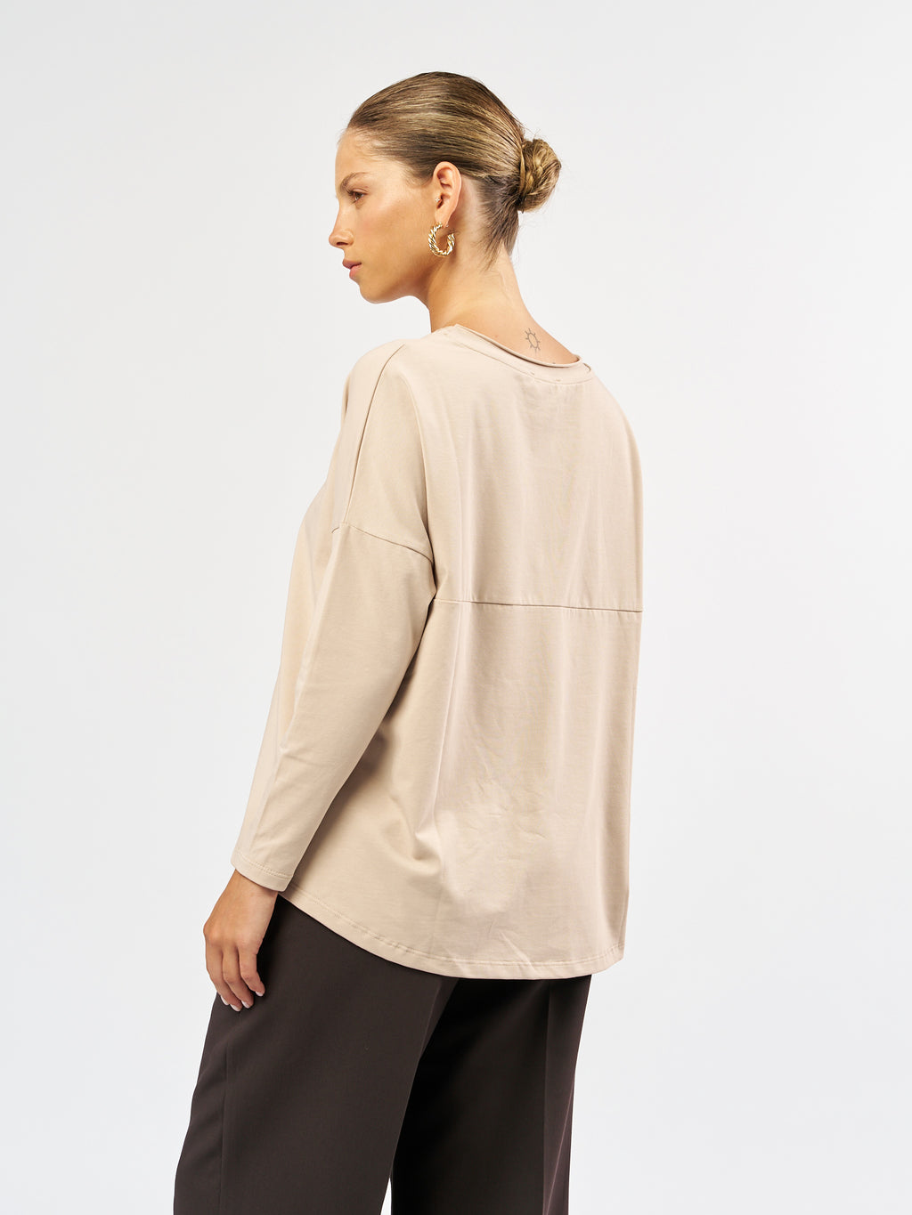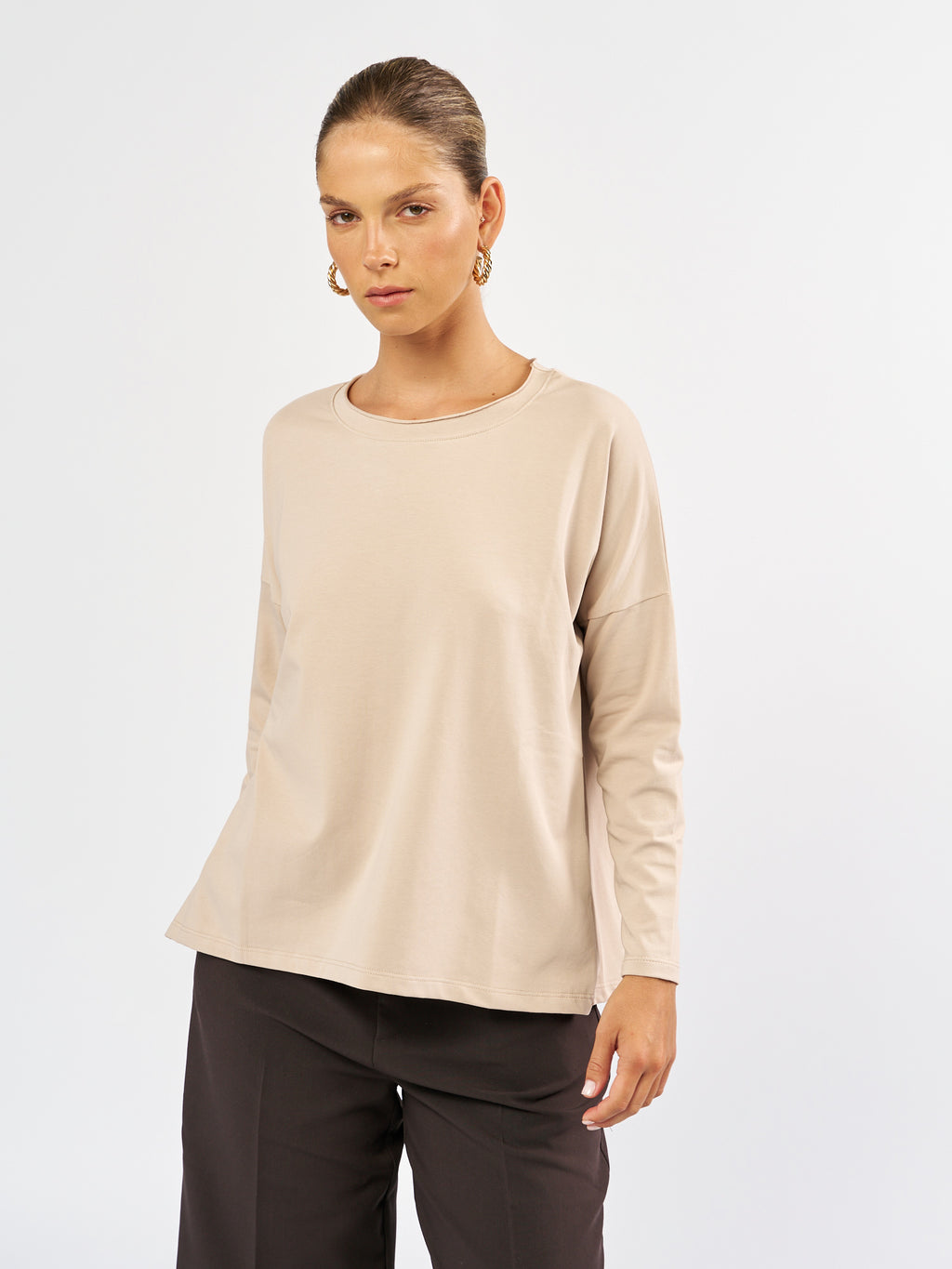 חולצת טי אלאיה היא חולצת בסיס על זמנית בגזרה רפויה ונינוחה עם מפתח עגול, שרוולים ארוכים ותפר אופקי בגב שמעניק לה טוויסט עיצובי מעודן