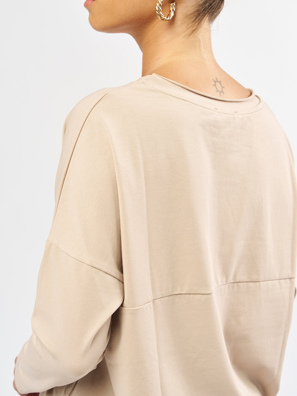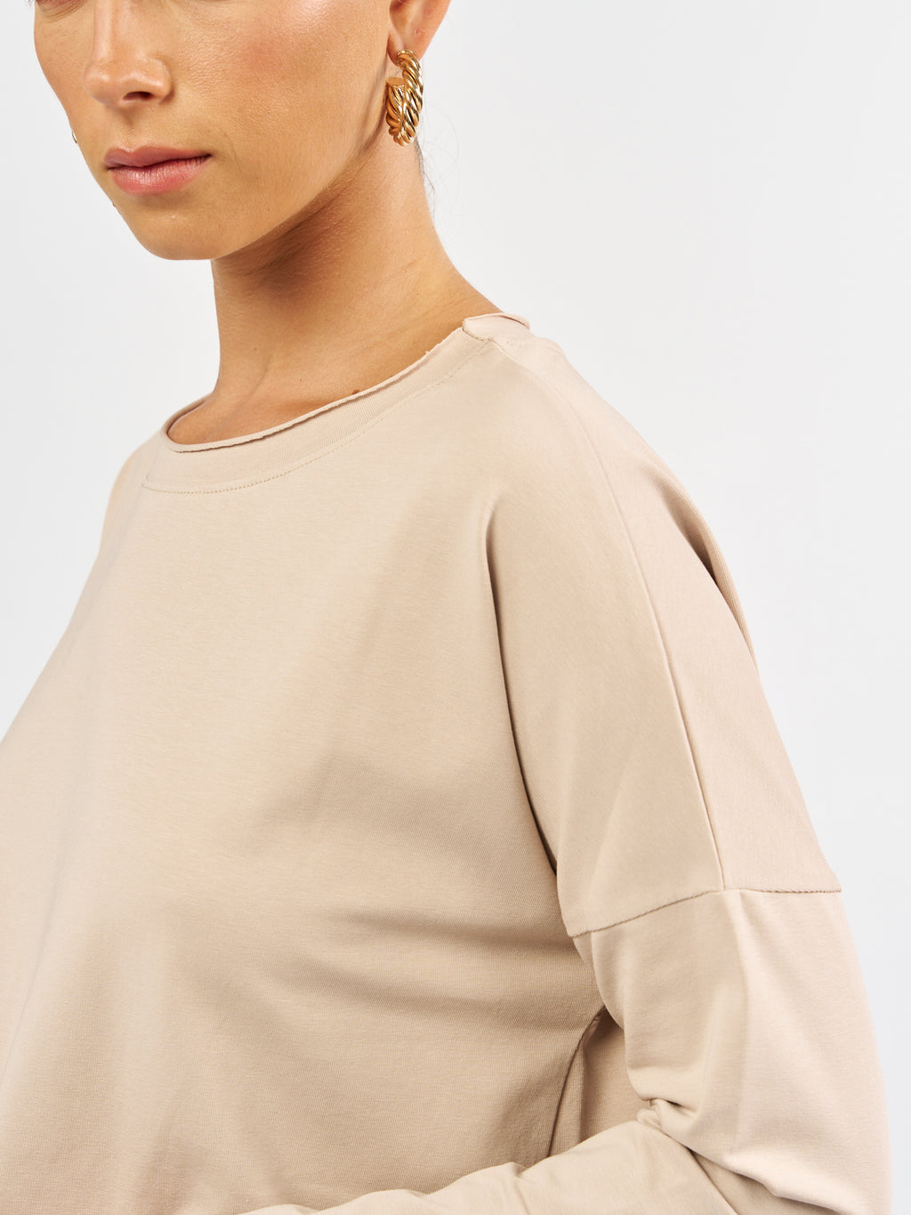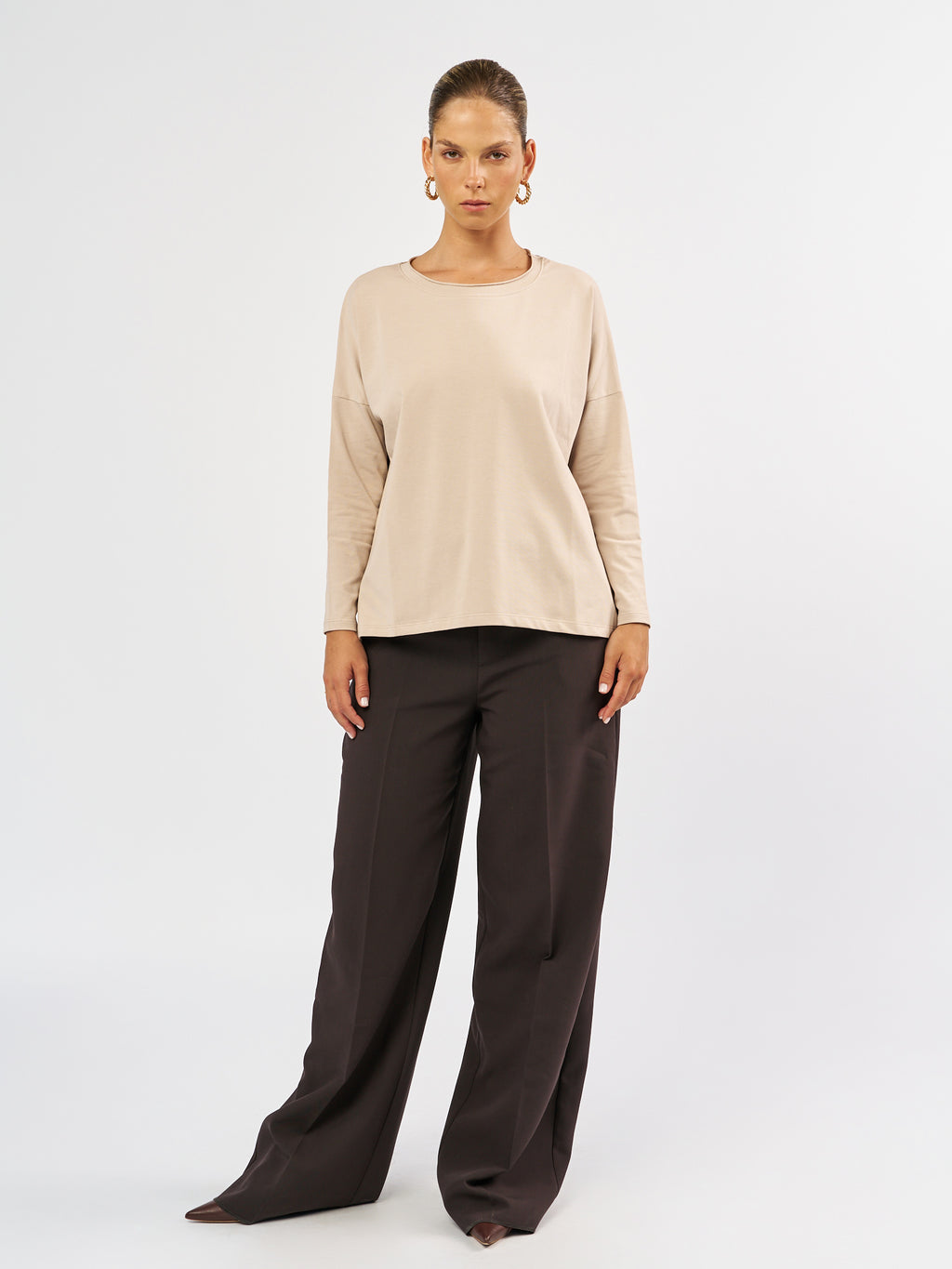 חולצת טי אלאיה היא חולצת בסיס על זמנית בגזרה רפויה ונינוחה עם מפתח עגול, שרוולים ארוכים ותפר אופקי בגב שמעניק לה טוויסט עיצובי מעודן