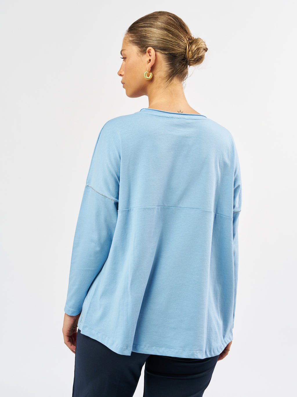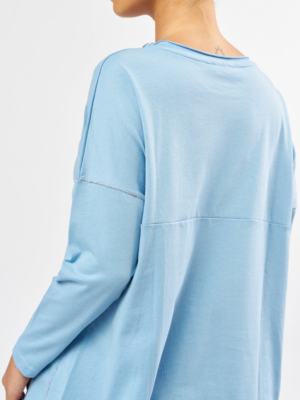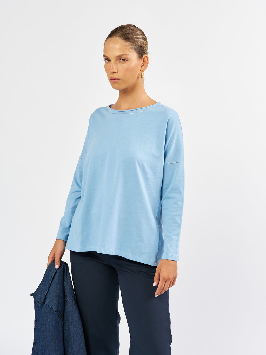 חולצת טי דוריס עשויה מ-100% כותנה רכה ואוורירית בגזרה רפויה ונינוחה עם שרוולים ארוכים, כתפיים שמוטות ופתח צוואר עגול ונקי