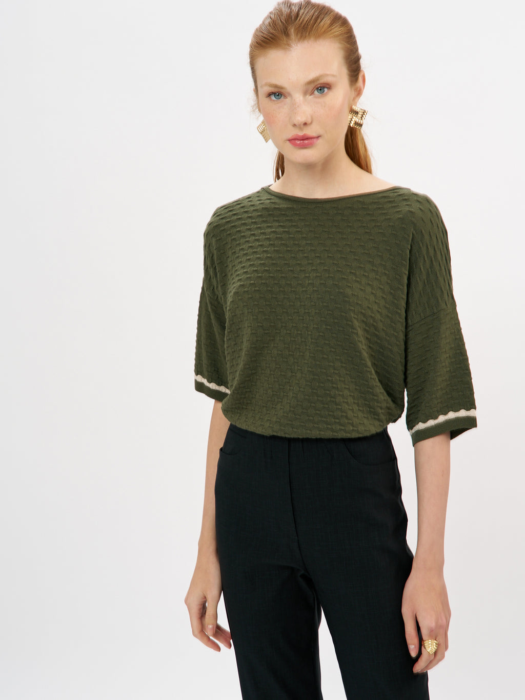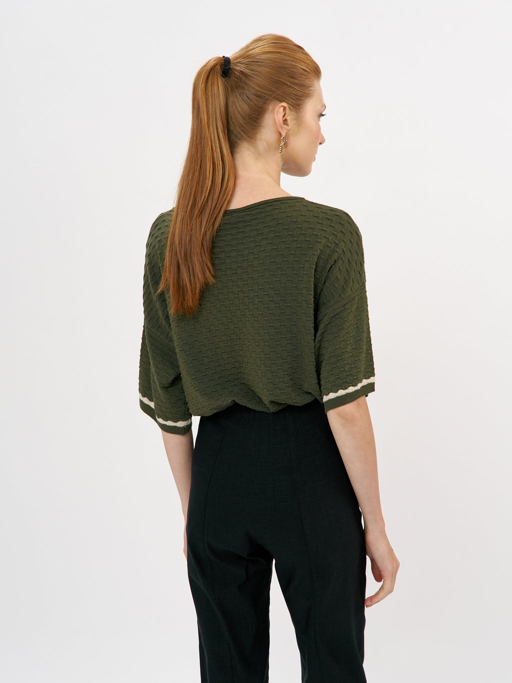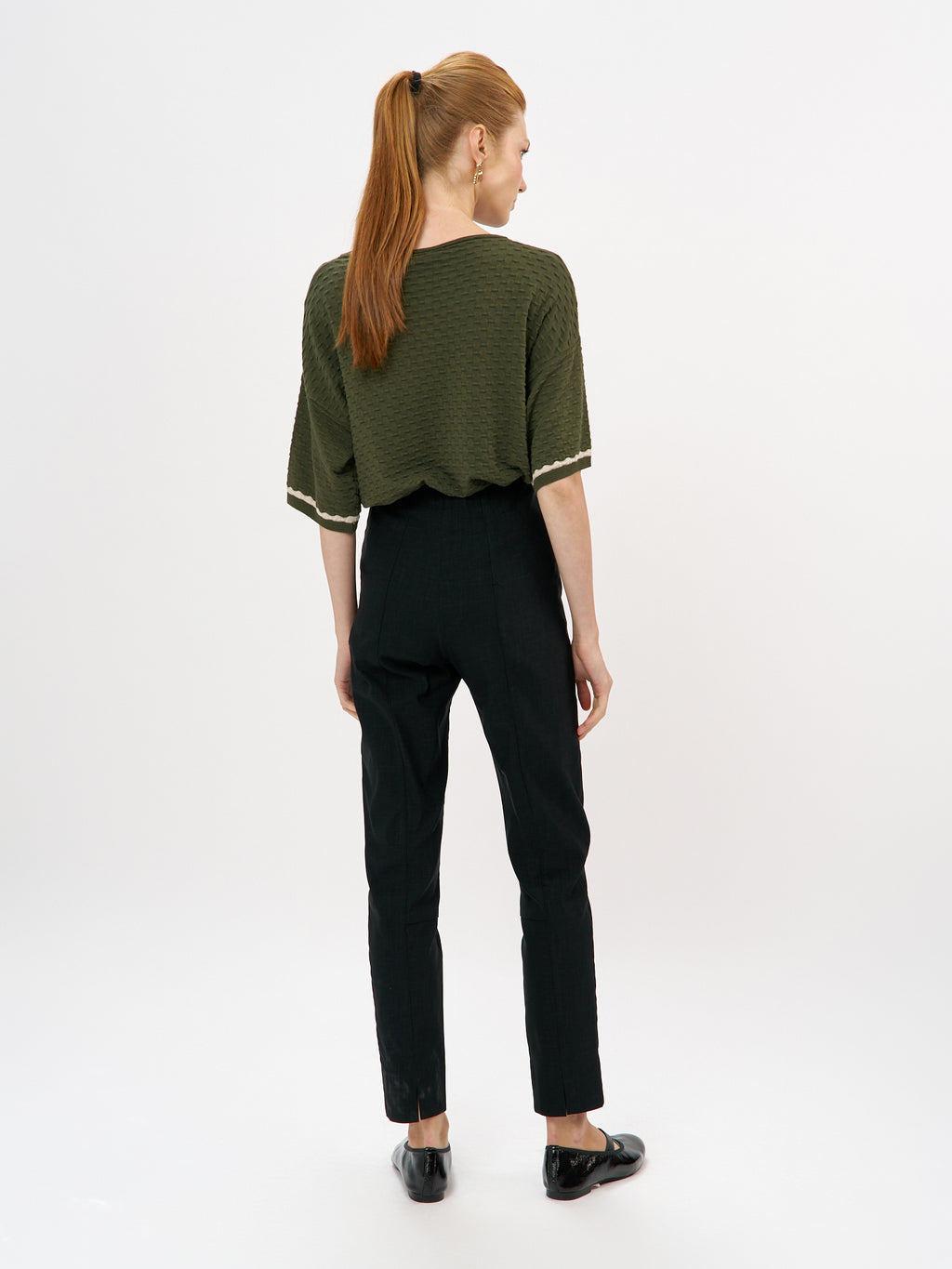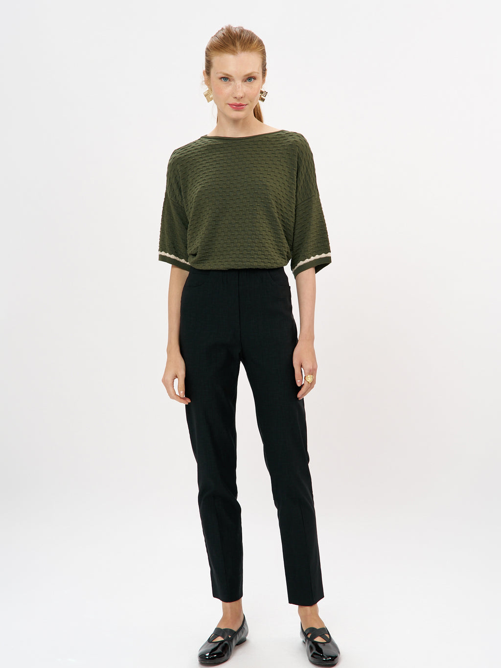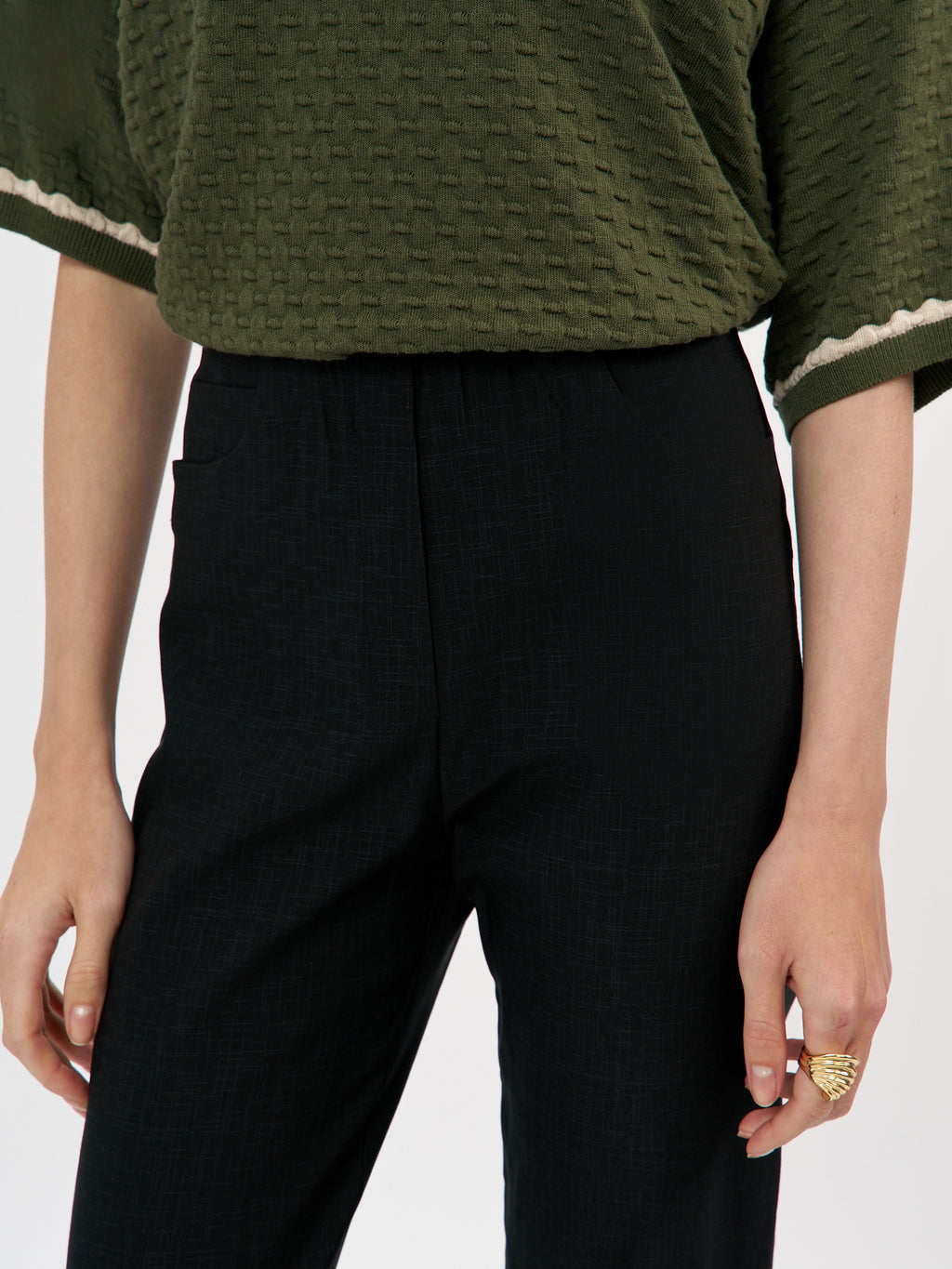מכנסי סקיני באורך קרסול בעלי כיסי דמה בחלקם העליון ונרבירים קטנים בחלקם הקדמי התחתון. למכנסיים גומי פנימי באזור המותן לנוחות מירבית. המכנסיים עשויים אריג אלסטי נעים למגע. פריט על זמני הקל לשילוב עם פריטים רבים במלתחתך