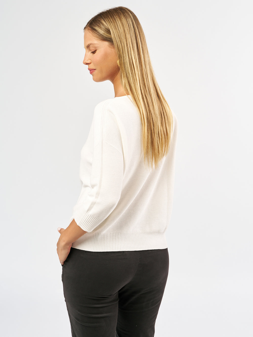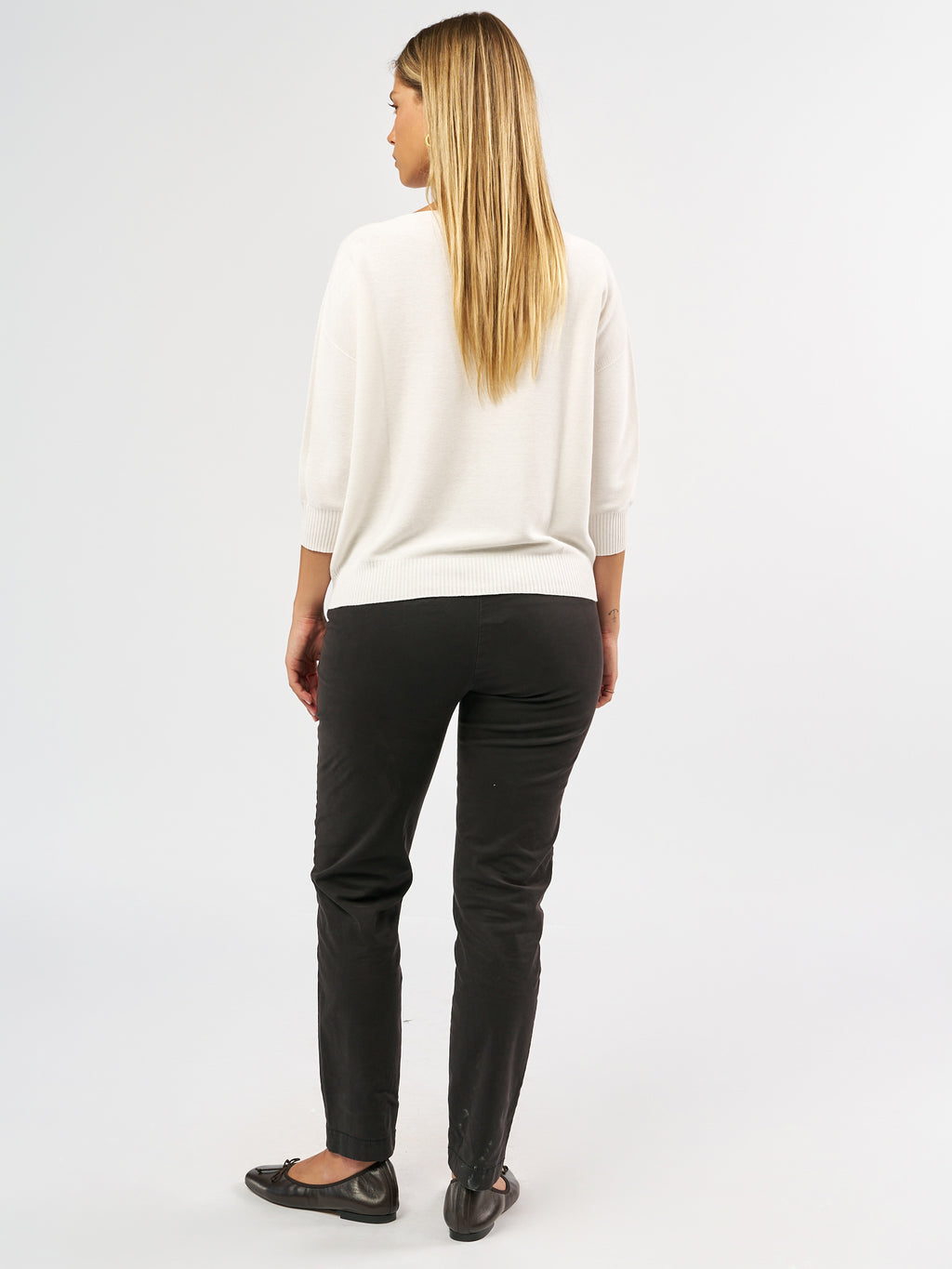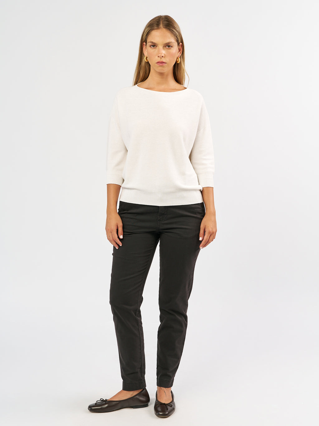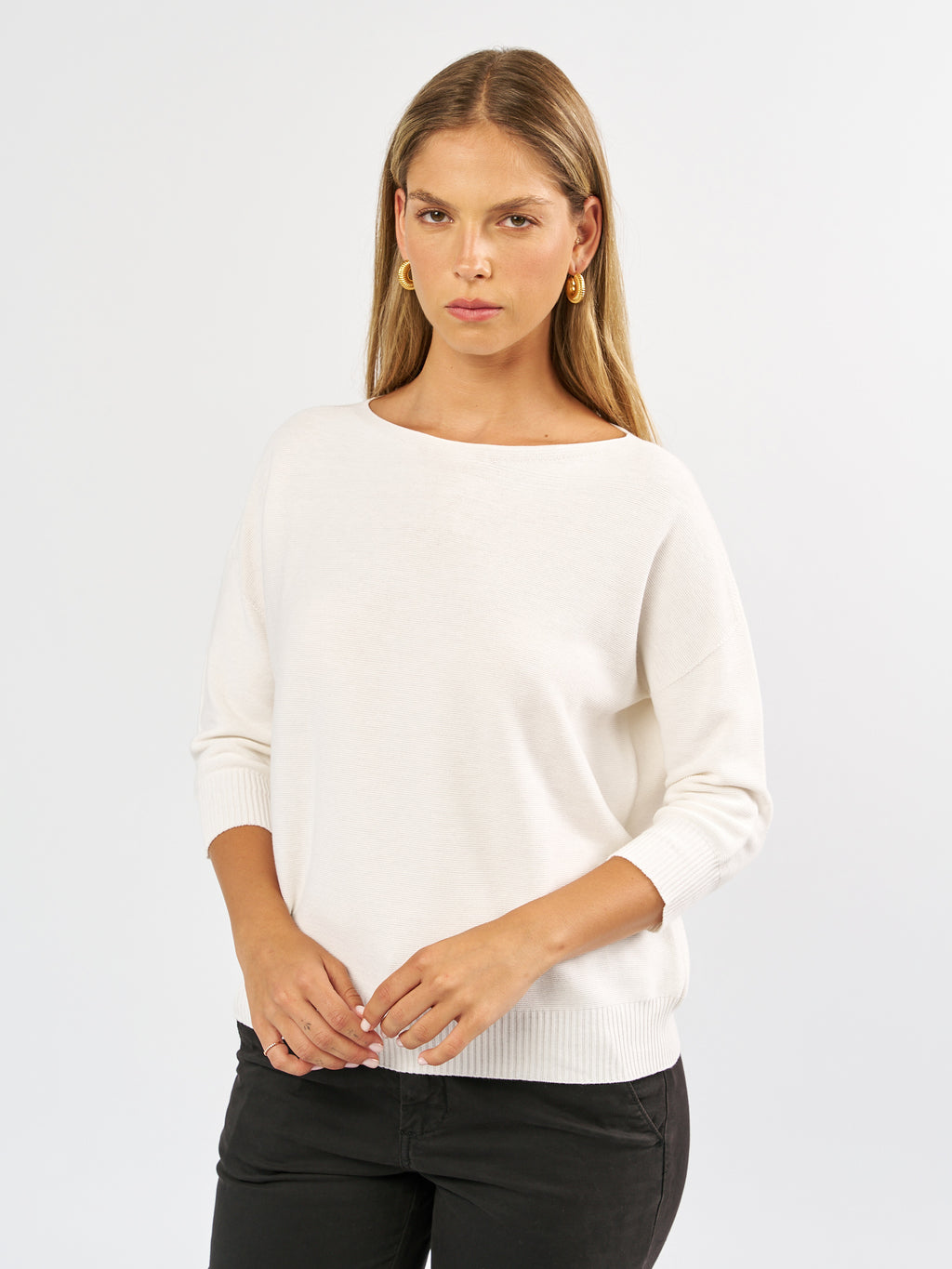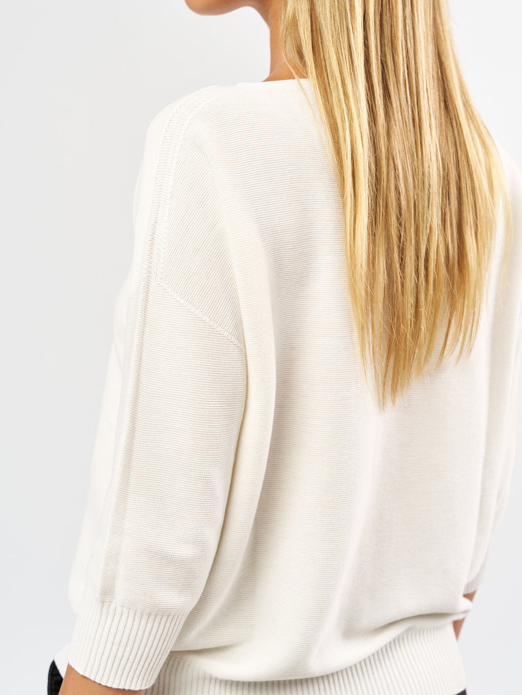 סריג קלאסי בגזרת בוקסה רכה ומעט אוברסייז עם מחשוף סירה וחצי שרוול בגימור ריב מחמיא