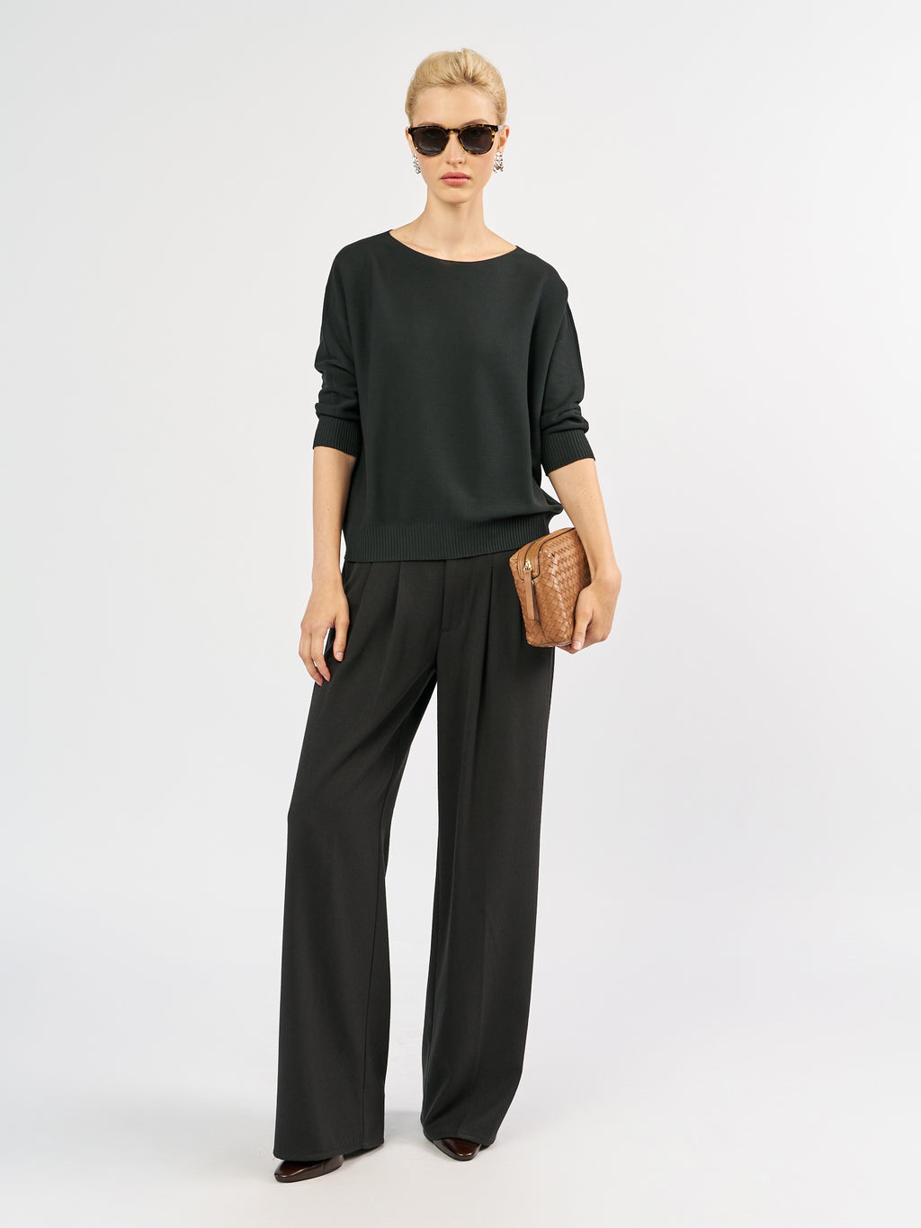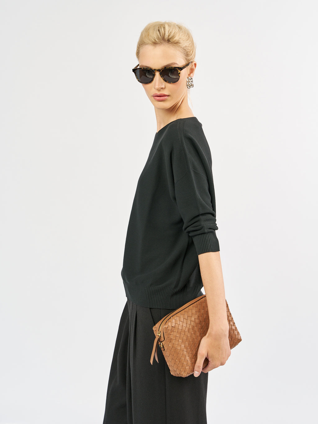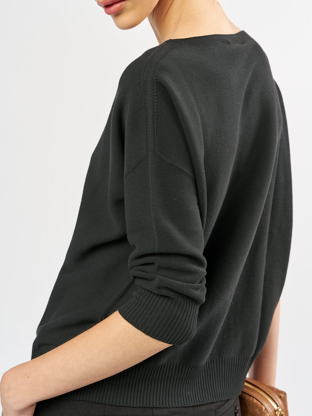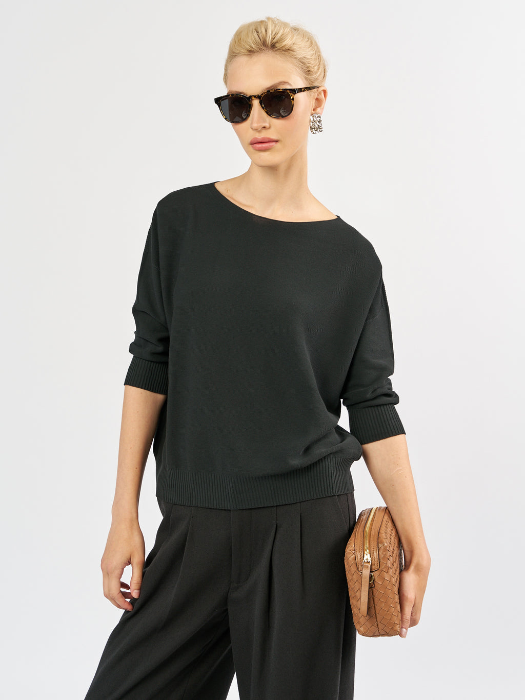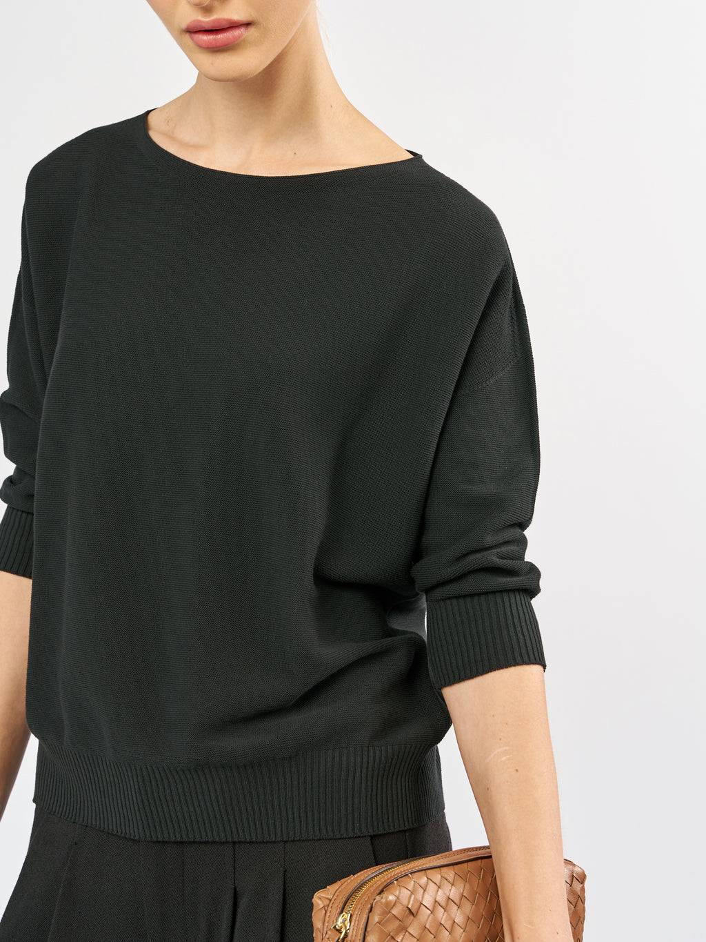 סריג קלאסי בגזרת בוקסה רכה ומעט אוברסייז עם מחשוף סירה וחצי שרוול בגימור ריב מחמיא