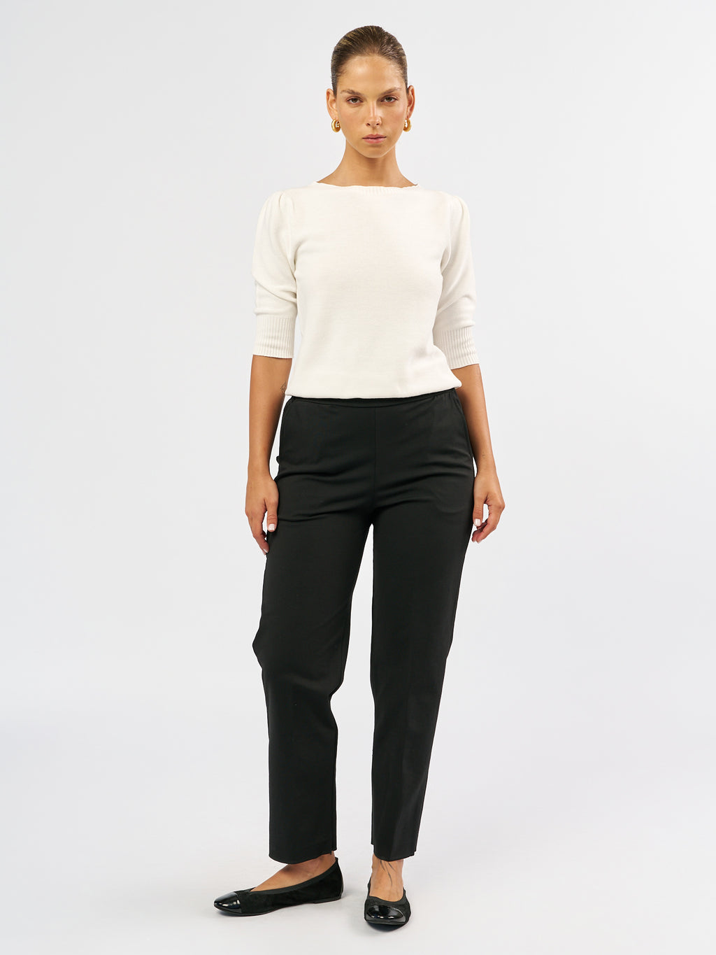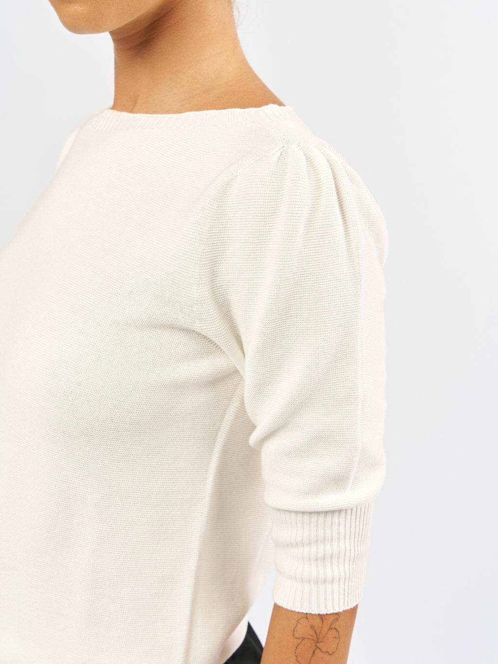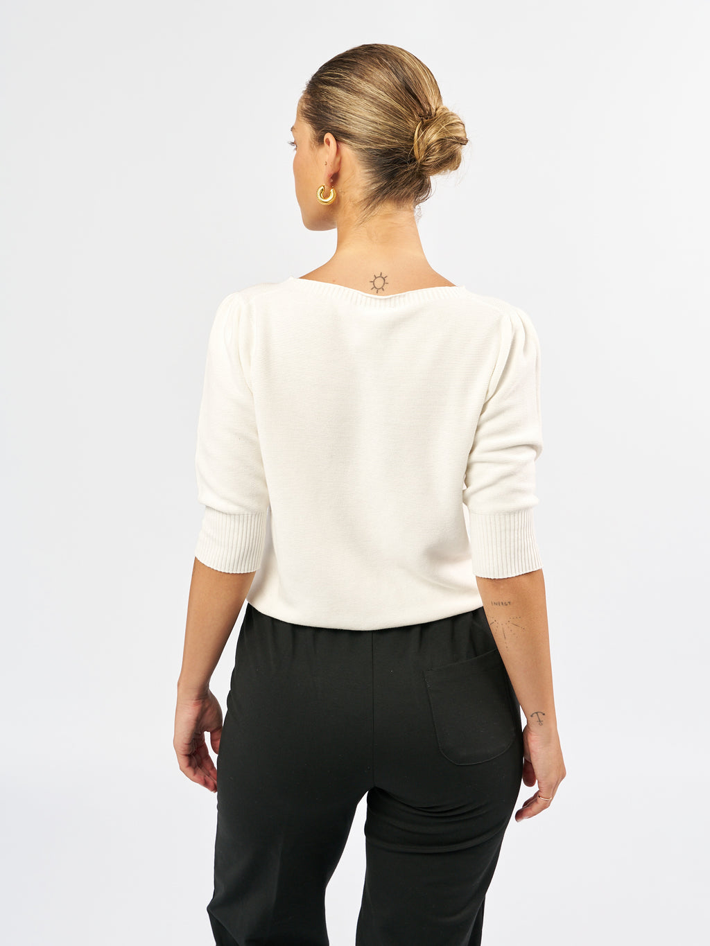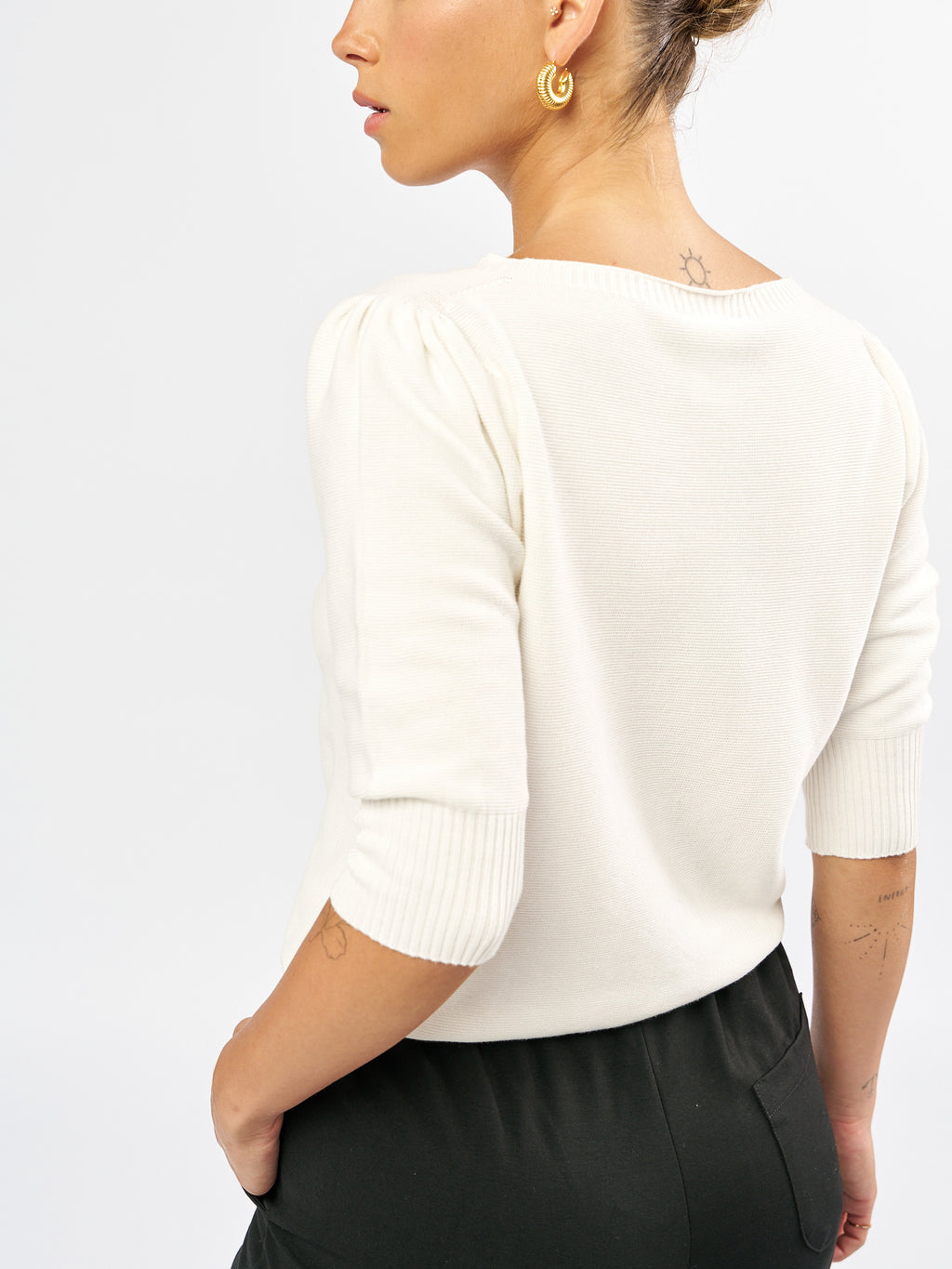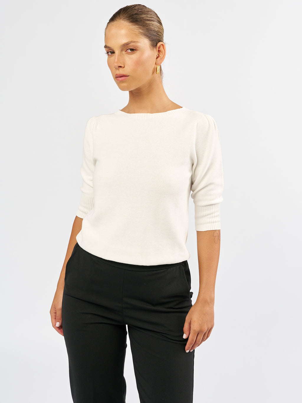 סריג מירנדה הוא פריט על-זמני עם ניחוח רומנטי וגזרה מדויקת. עשוי סריג חלק ונעים בגימור מחויט, עם שרוולי חצי באורך מחמיא וכתפיים מעודנות עם כיווצים – שמוסיפים טאץ' נשי ורך. הגזרה צמודה אך לא הדוקה, עם פסי ריב סרוגים בצווארון, בקו המכפלת ובשרוולים, להשלמת מראה מוקפד שמתאים בקלות גם ליומיום וגם למראה ערב.