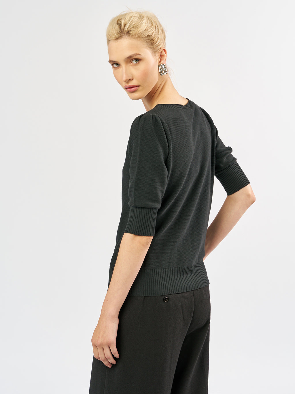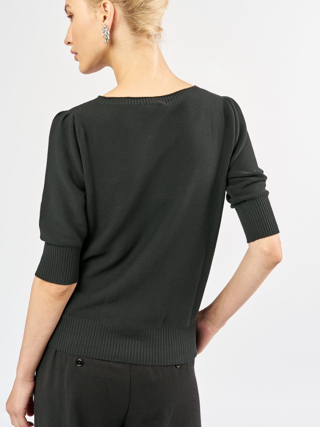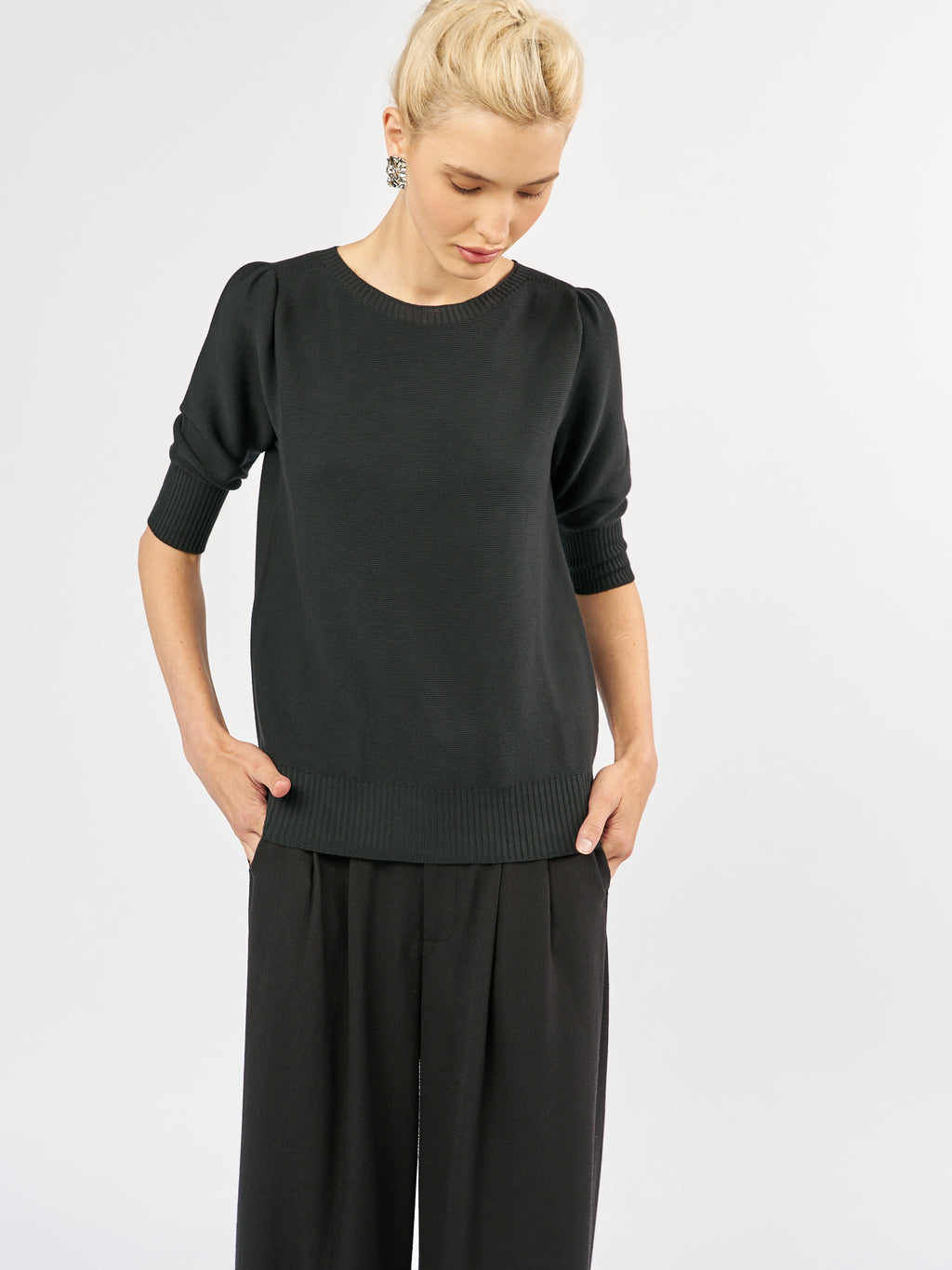 סריג מירנדה הוא פריט על-זמני עם ניחוח רומנטי וגזרה מדויקת. עשוי סריג חלק ונעים בגימור מחויט, עם שרוולי חצי באורך מחמיא וכתפיים מעודנות עם כיווצים – שמוסיפים טאץ' נשי ורך. הגזרה צמודה אך לא הדוקה, עם פסי ריב סרוגים בצווארון, בקו המכפלת ובשרוולים, להשלמת מראה מוקפד שמתאים בקלות גם ליומיום וגם למראה ערב.