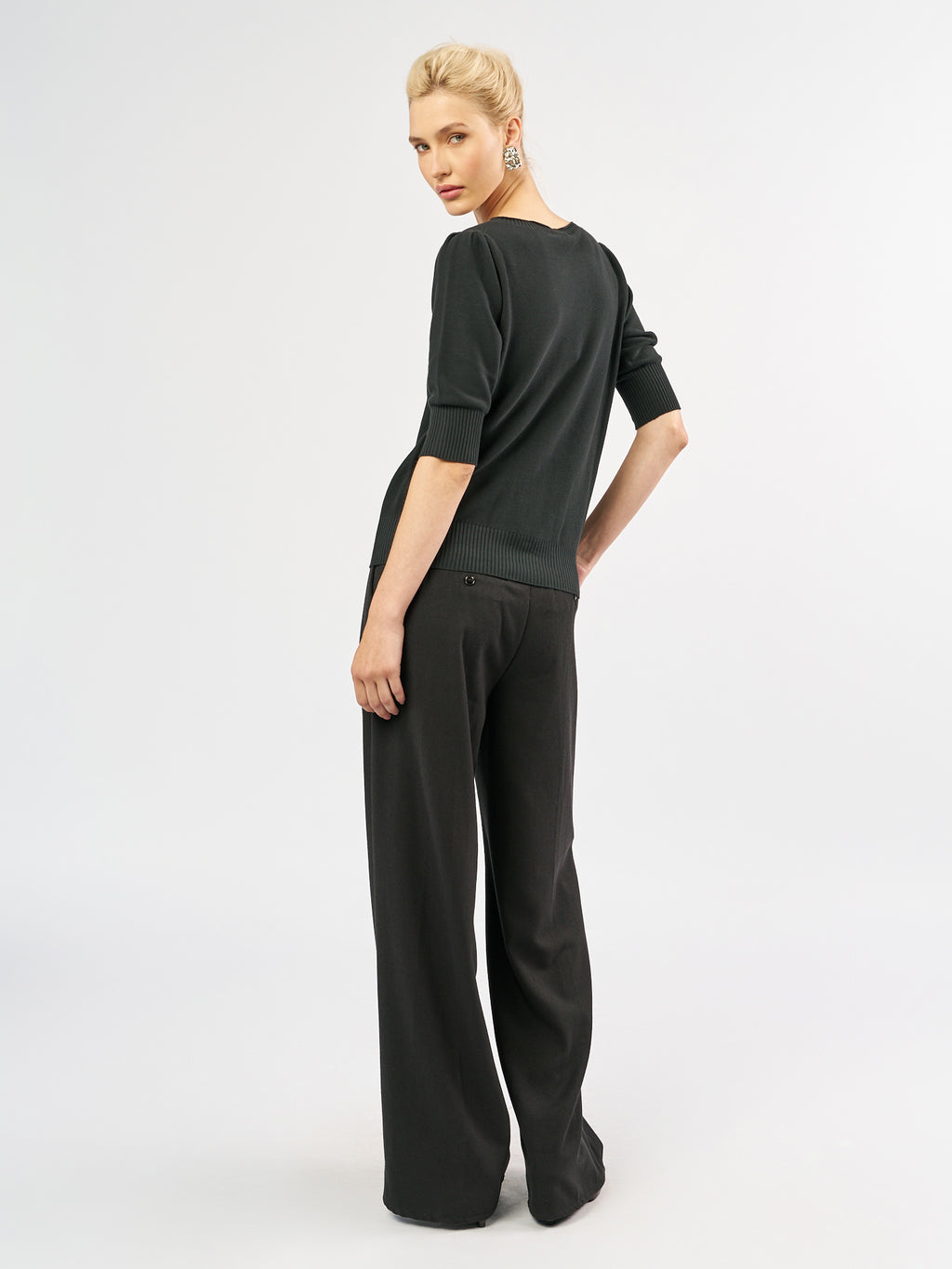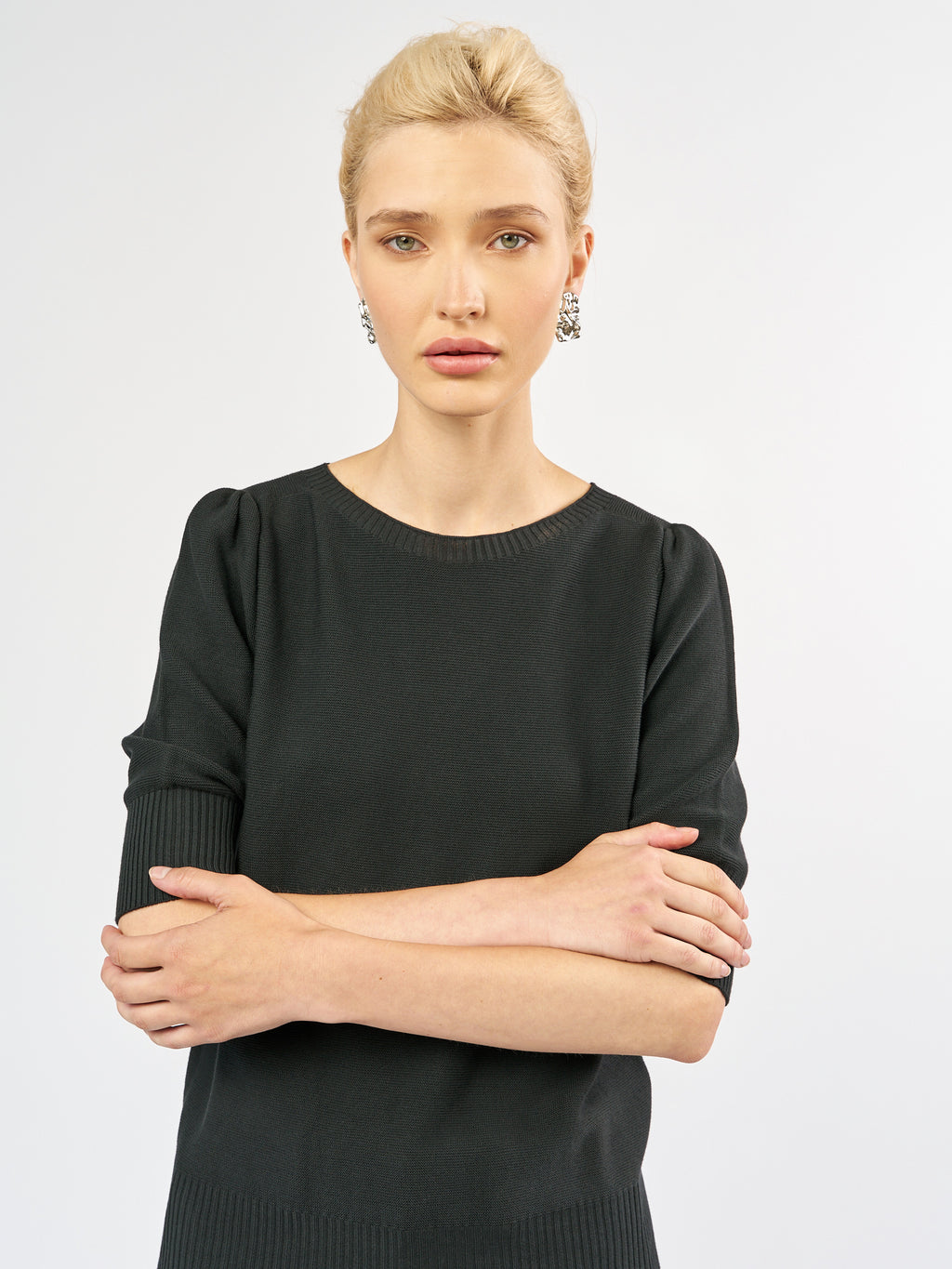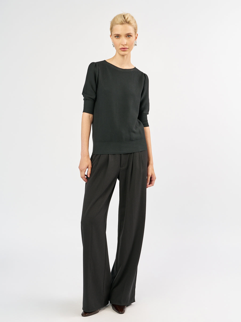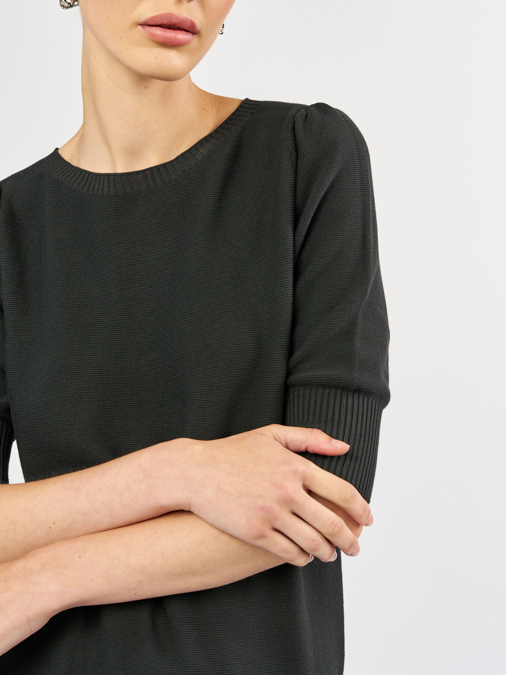 סריג מירנדה הוא פריט על-זמני עם ניחוח רומנטי וגזרה מדויקת. עשוי סריג חלק ונעים בגימור מחויט, עם שרוולי חצי באורך מחמיא וכתפיים מעודנות עם כיווצים – שמוסיפים טאץ' נשי ורך. הגזרה צמודה אך לא הדוקה, עם פסי ריב סרוגים בצווארון, בקו המכפלת ובשרוולים, להשלמת מראה מוקפד שמתאים בקלות גם ליומיום וגם למראה ערב.