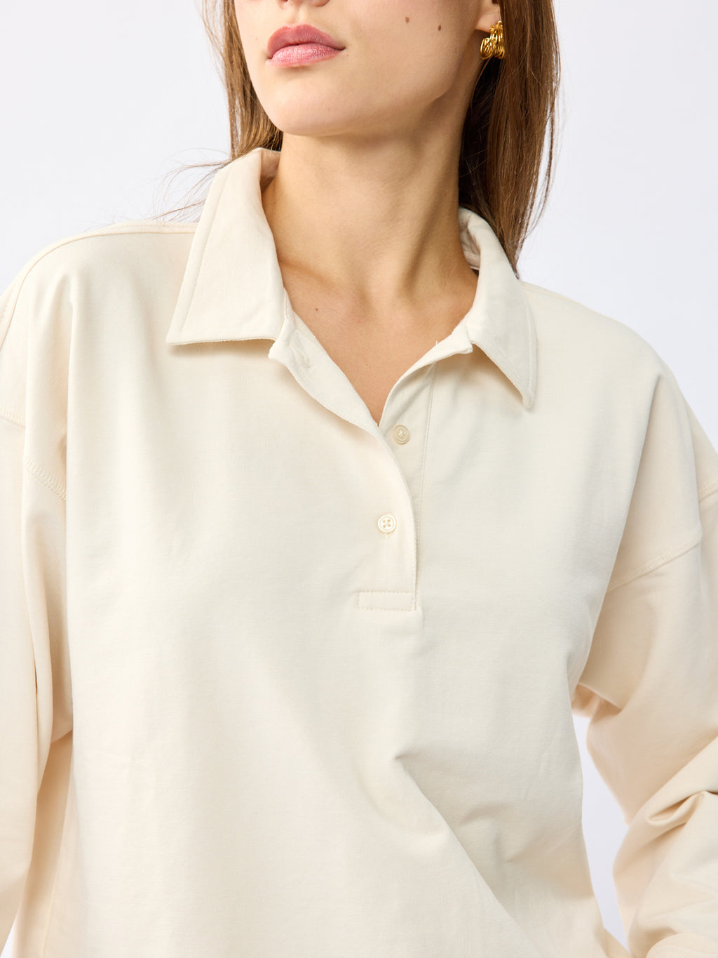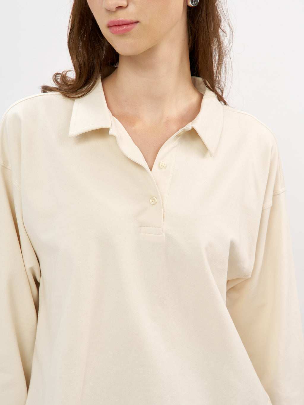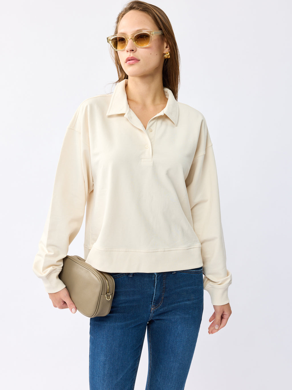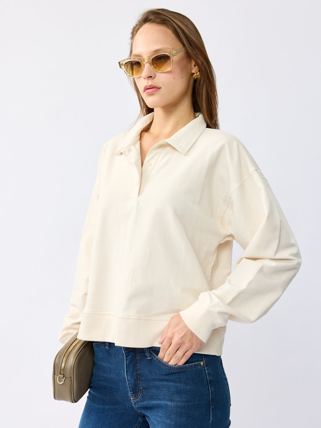 העיצוב הקלאסי עם צווארון וכפתורים חלקיים יוצר איזון מושלם בין קז׳ואל לאלגנטי