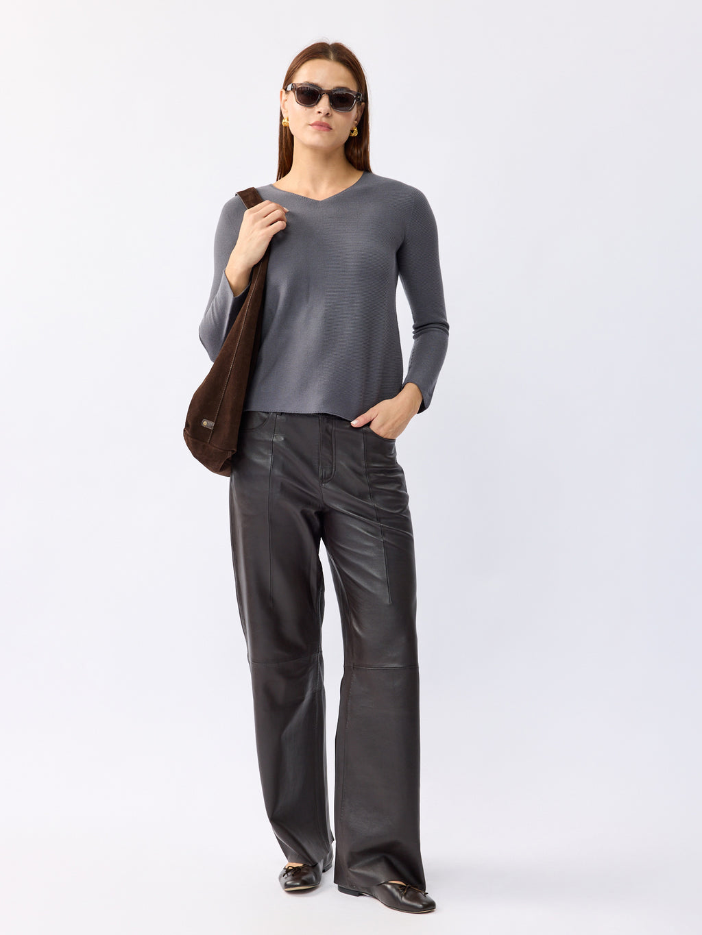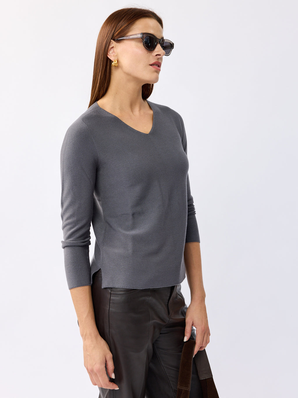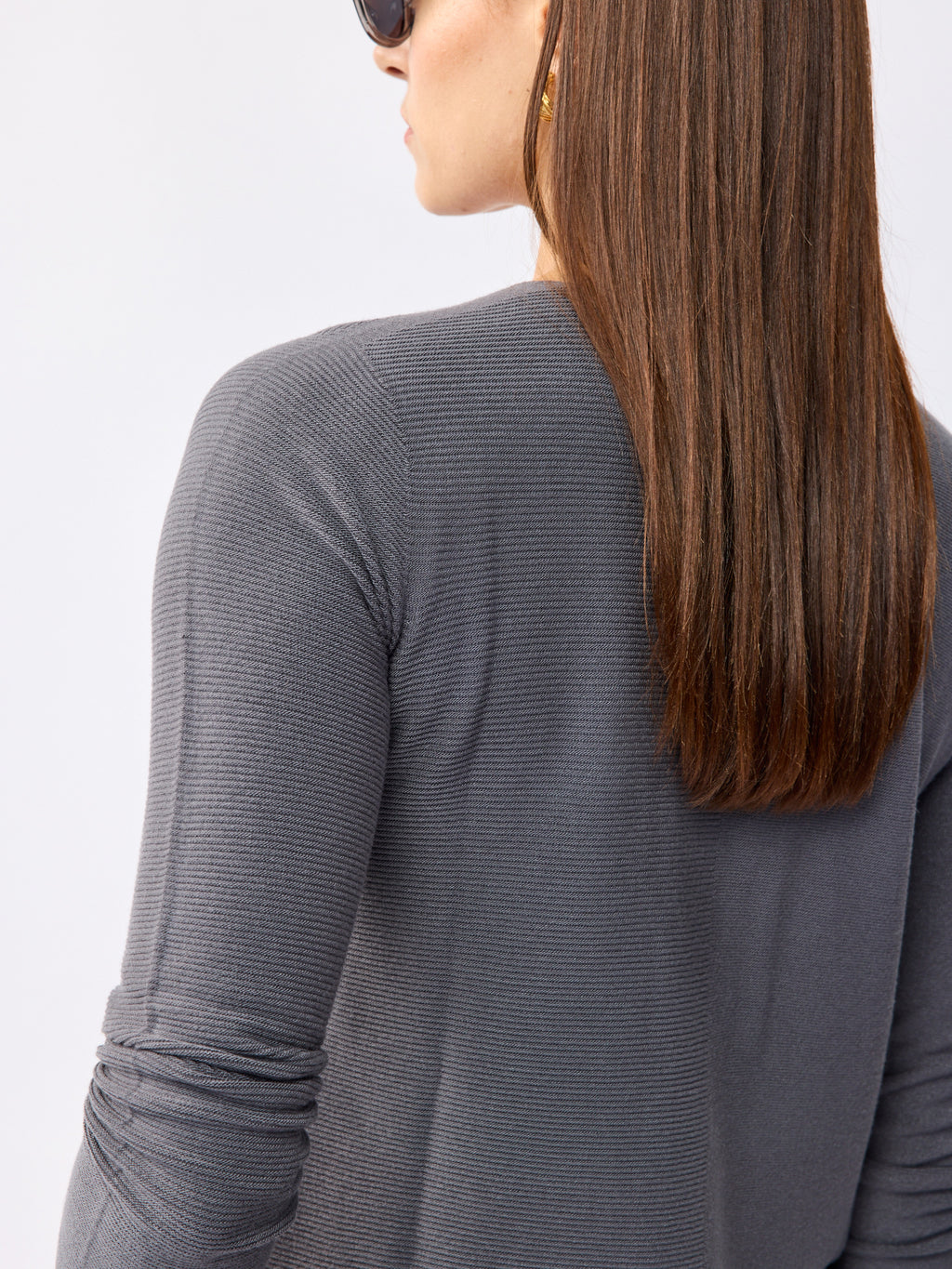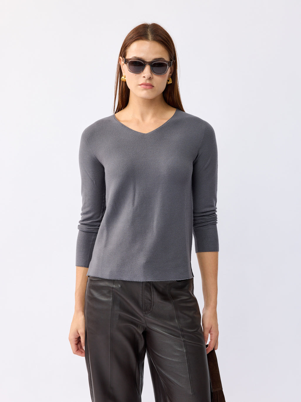 סריג קלייר הוא סריג דק ורך במרקם סריגת ריב עדינה, עם מחשוף V מחמיא ועיצוב נקי שמעניק מראה אלגנטי ביום יום. הקו האנכי בסריג מדגיש את הגוף בצורה מחטבת ומוסיף עניין בלי לוותר על מראה מינימליסטי ומדויק. האורך הקלאסי ושסע צד קטן מאפשרים שילוב מושלם גם בתוך המכנס וגם מחוצה לו. סריג רב עונתי שמתאים לשכבות בימים הקרים וללבישה נעימה בפני עצמה בתקופות מעבר