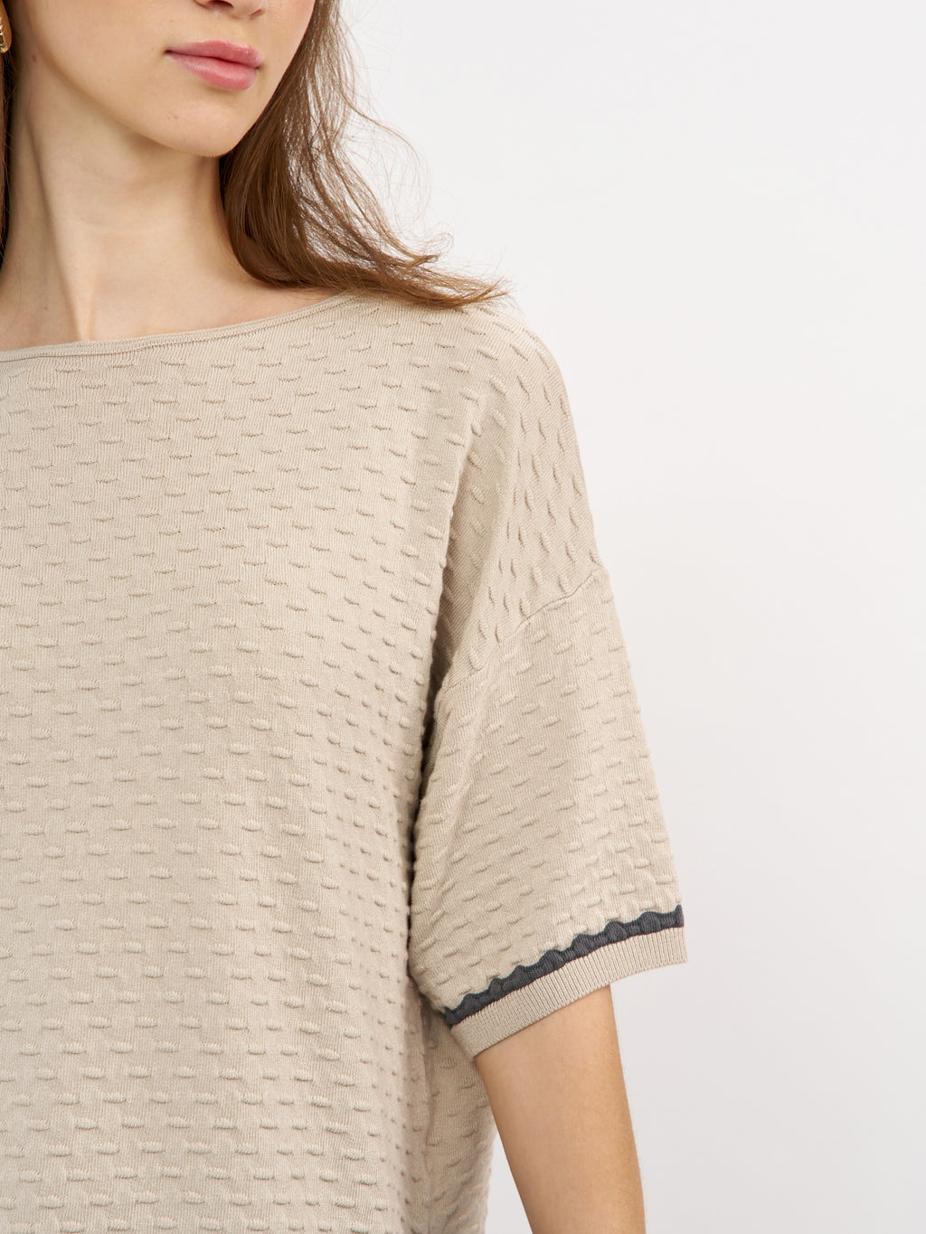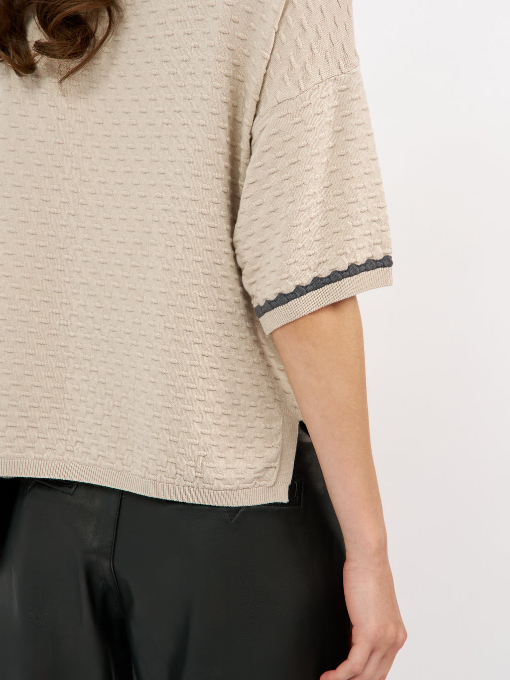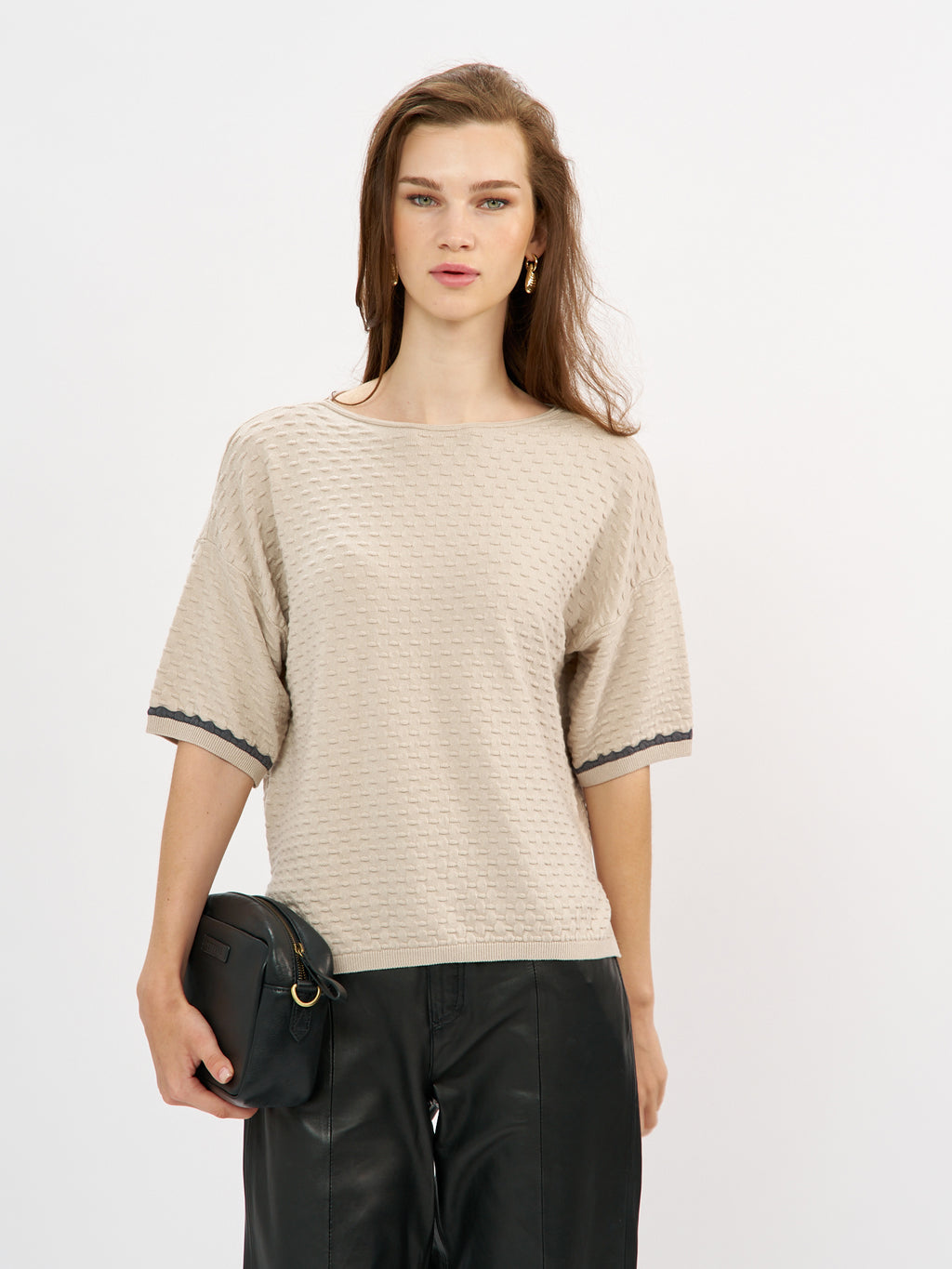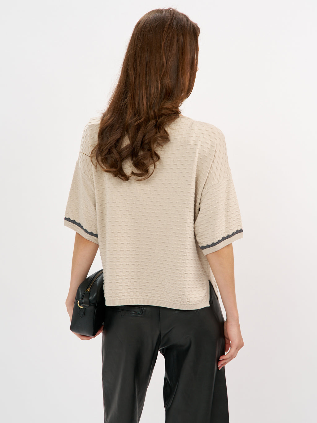 סריג קלרה הוא פריט קליל עם טאצ' אלגנטי בזכות טקסטורה עדינה שיוצרת מראה מובחן ומעודכן. הגזרה משוחררת ומפתח צוואר עגול נקי. השרוולים הקצרים מסתיימים בגימור מיוחד עם פס קונטרסט כהה שמוסיף עניין ועומק עיצובי