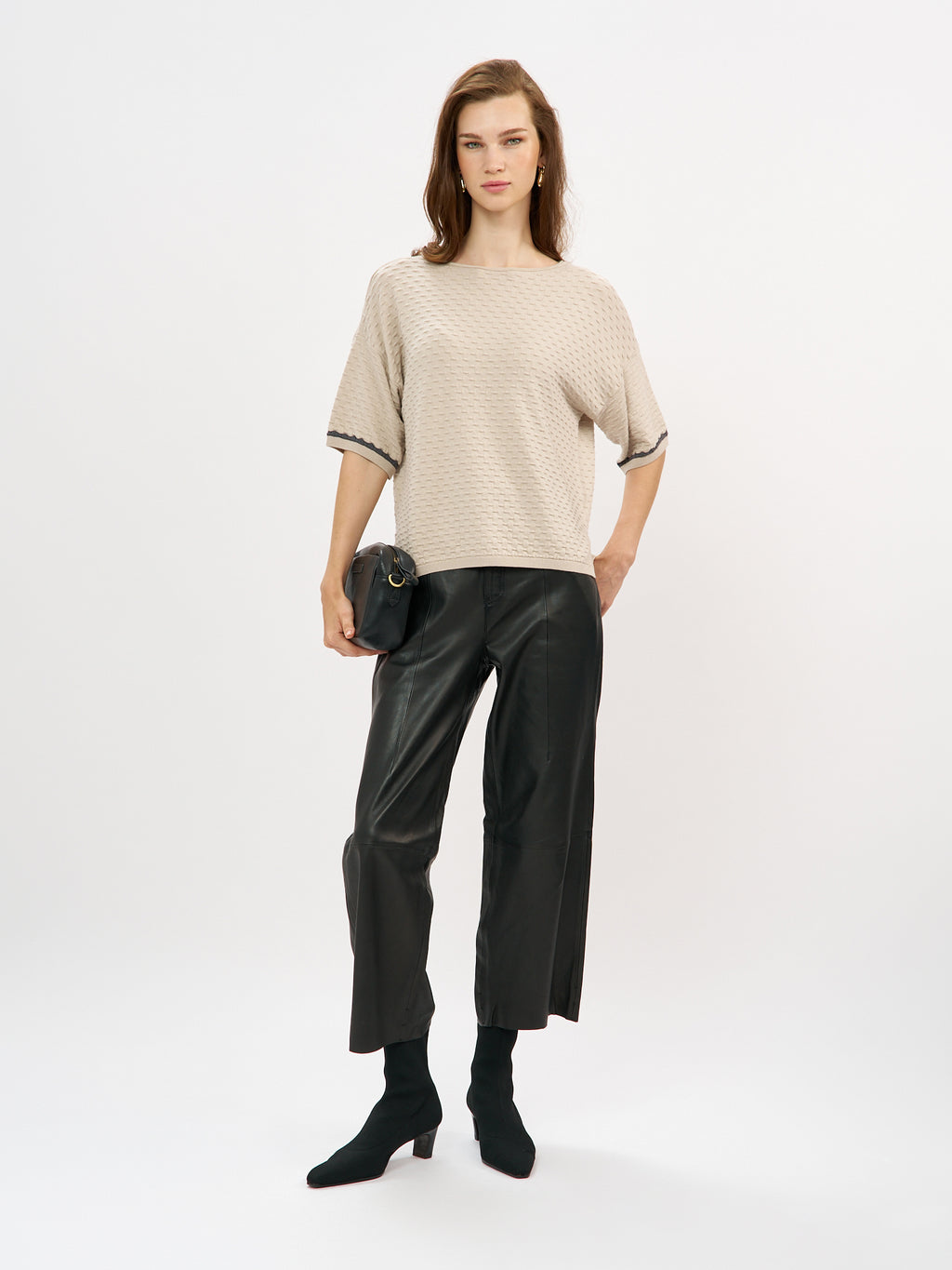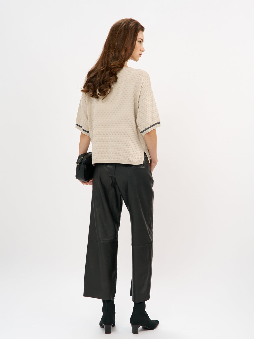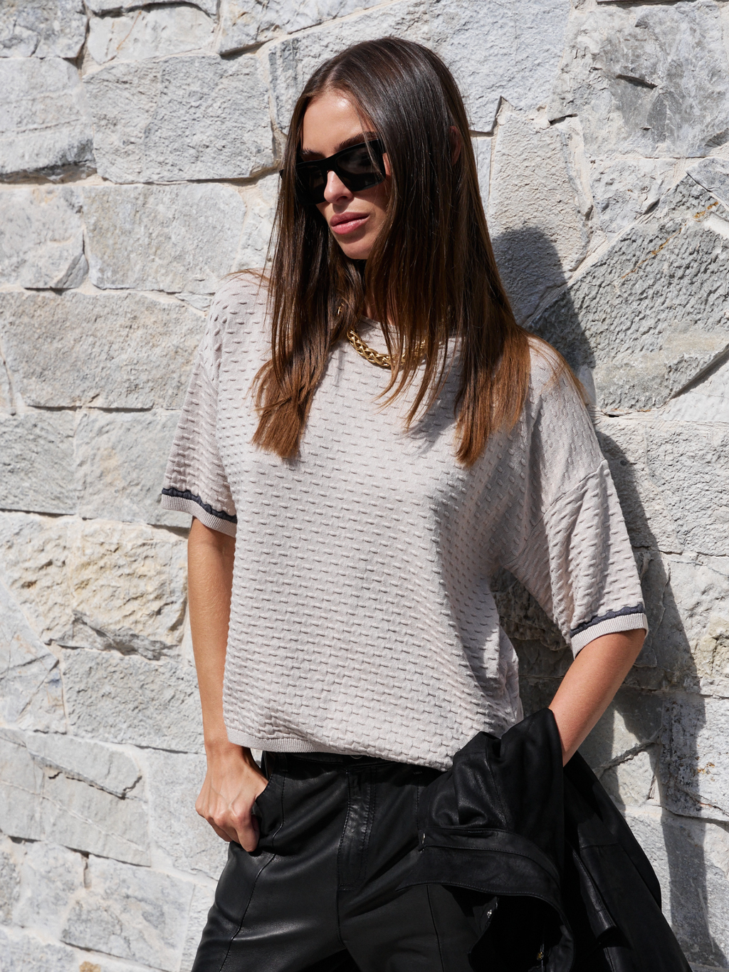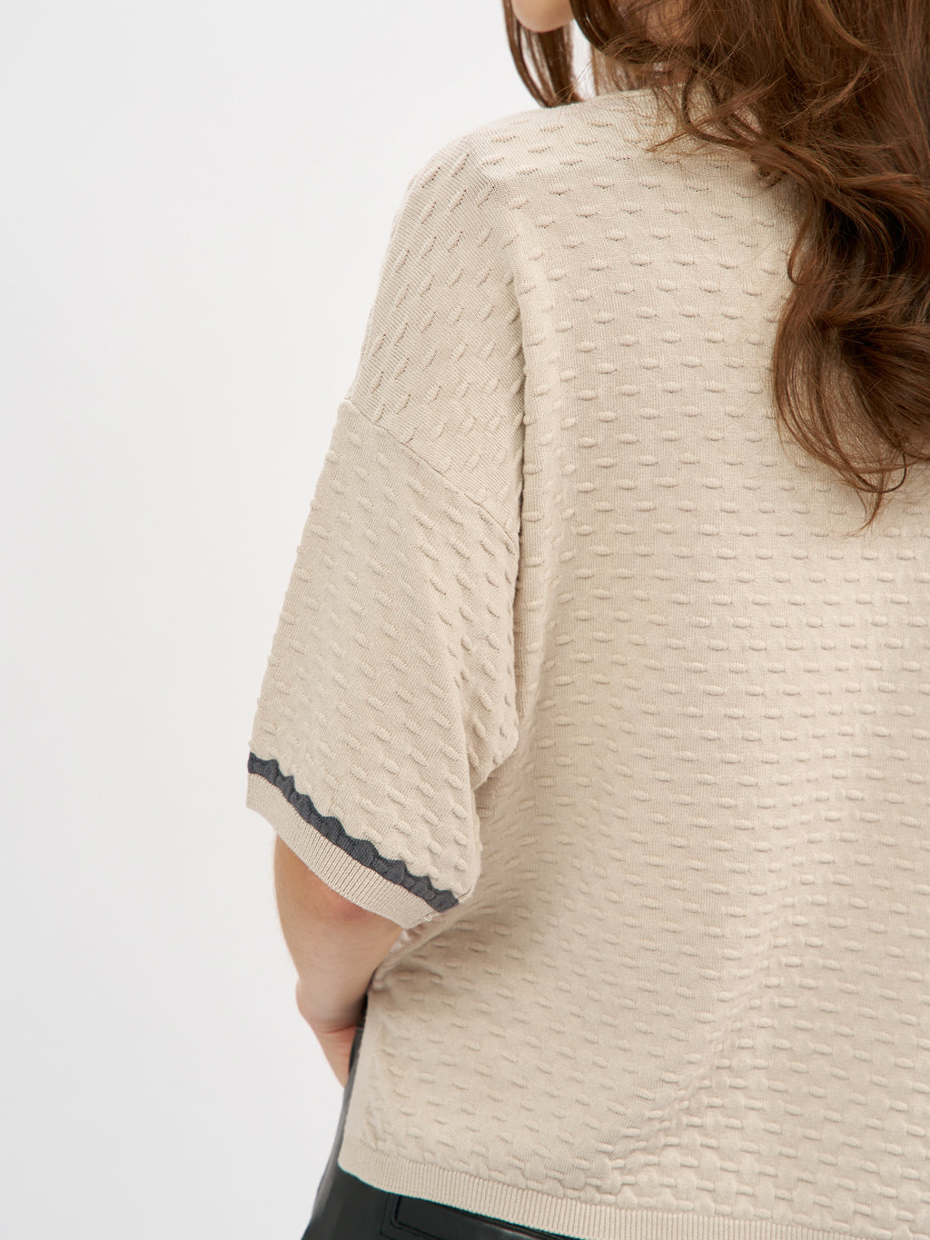 סריג קלרה הוא פריט קליל עם טאצ' אלגנטי בזכות טקסטורה עדינה שיוצרת מראה מובחן ומעודכן. הגזרה משוחררת ומפתח צוואר עגול נקי. השרוולים הקצרים מסתיימים בגימור מיוחד עם פס קונטרסט כהה שמוסיף עניין ועומק עיצובי