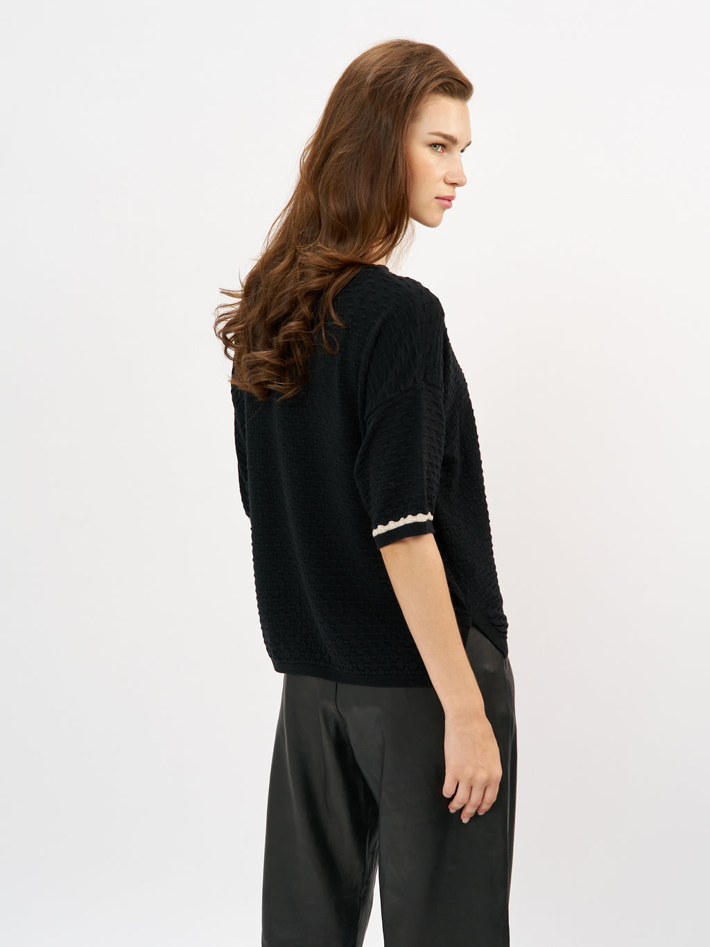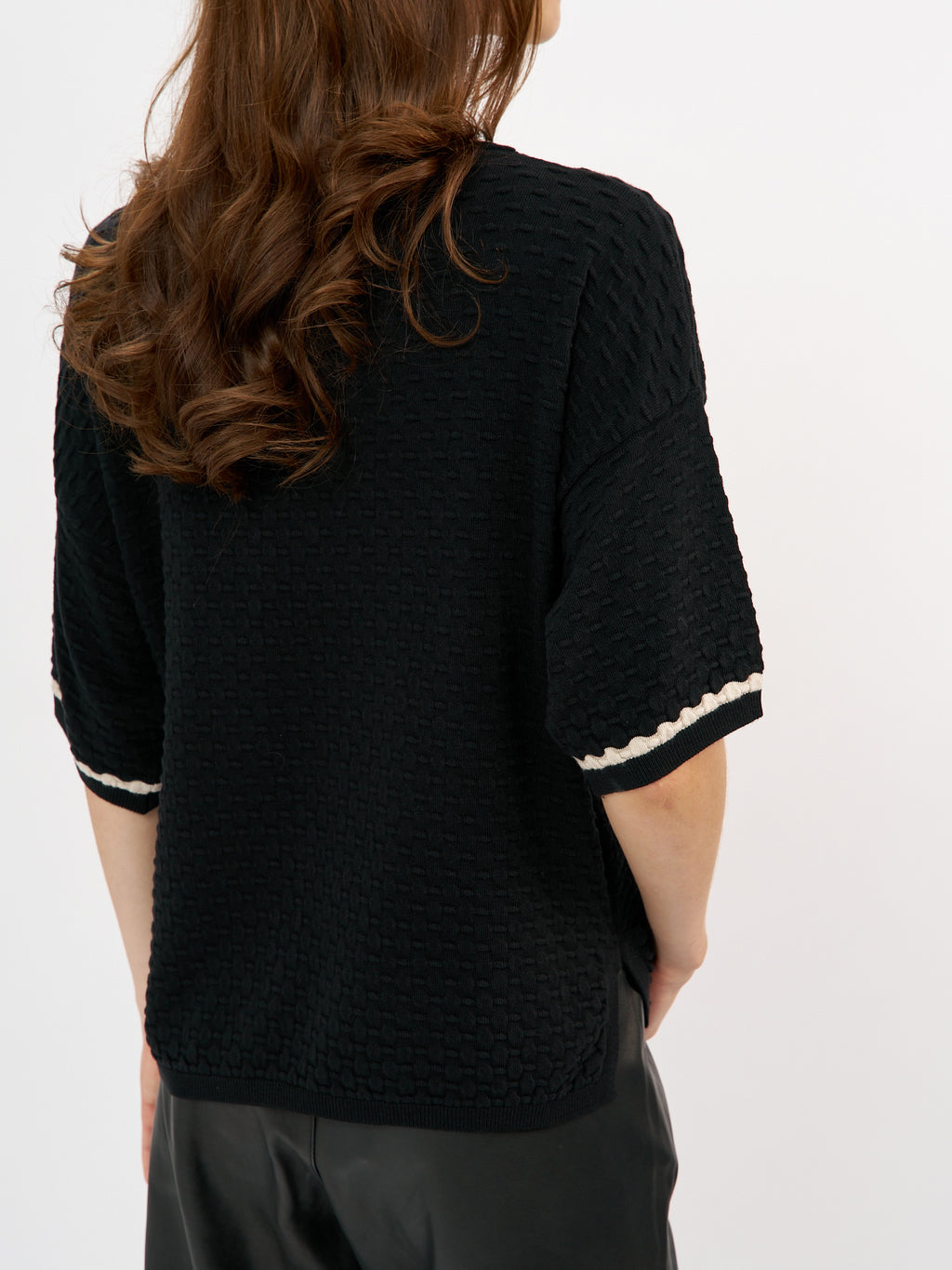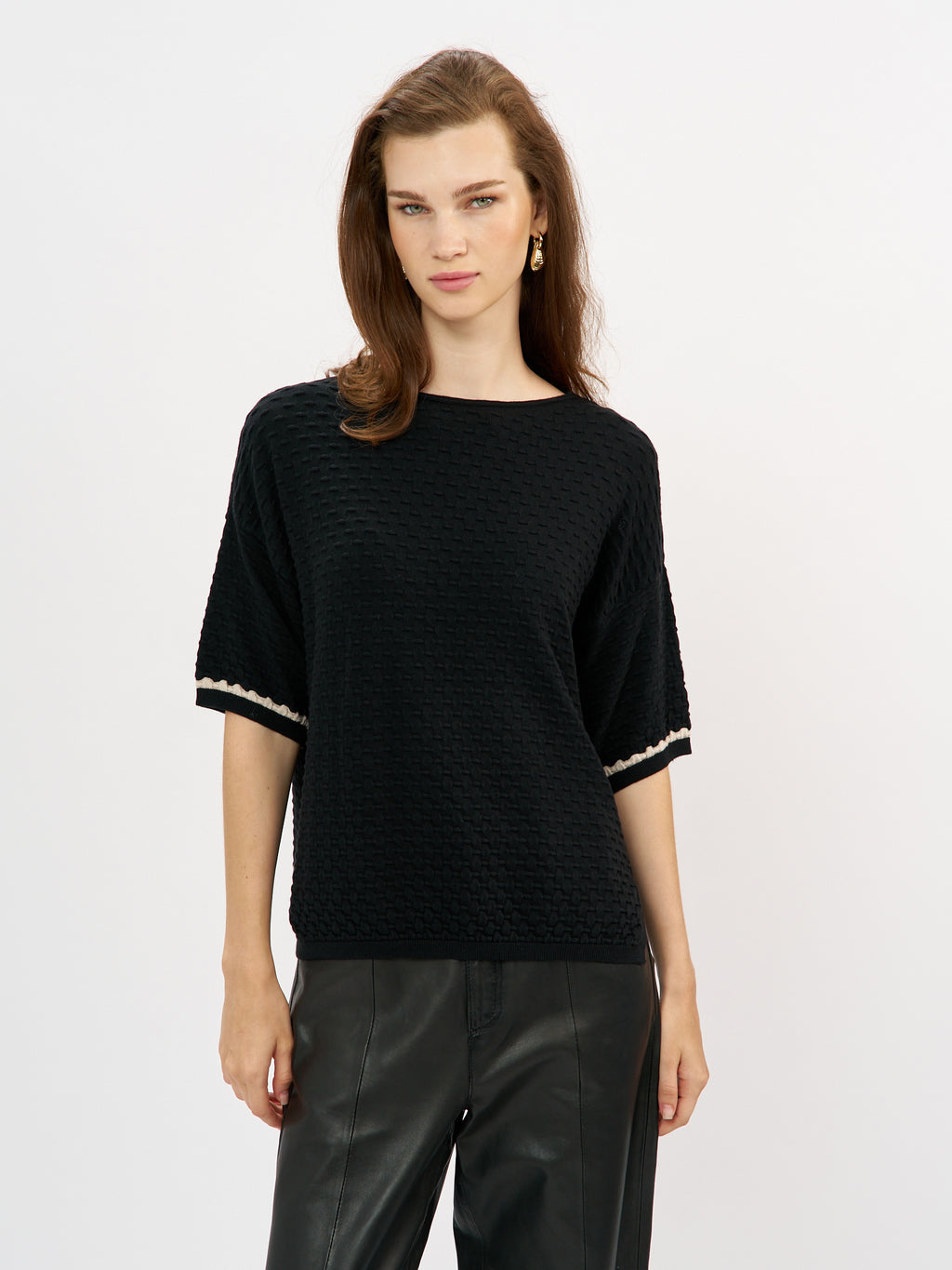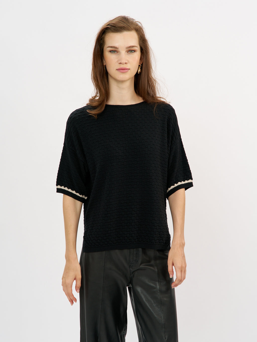סריג קלרה הוא פריט קליל עם טאצ' אלגנטי בזכות טקסטורה עדינה שיוצרת מראה מובחן ומעודכן. הגזרה משוחררת ומפתח צוואר עגול נקי. השרוולים הקצרים מסתיימים בגימור מיוחד עם פס קונטרסט בהיר שמוסיף עניין ועומק עיצובי