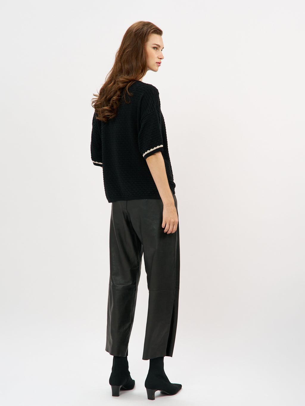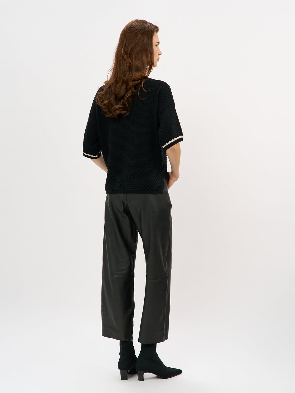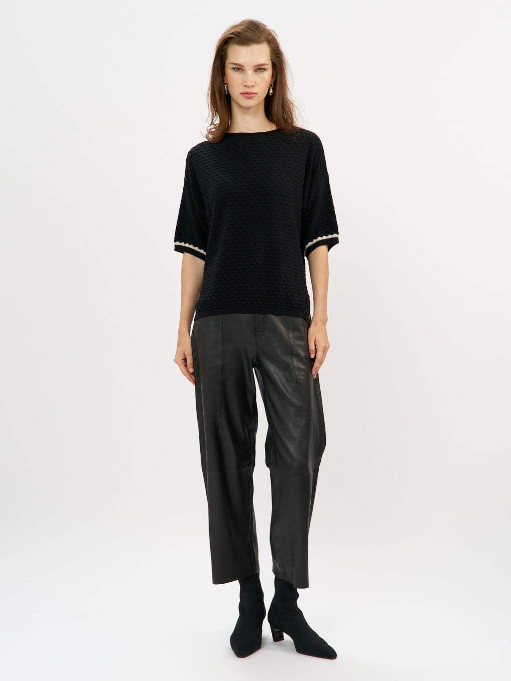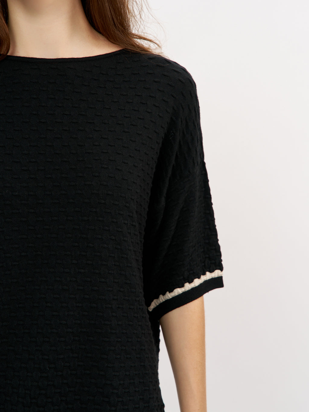 סריג קלרה הוא פריט קליל עם טאצ' אלגנטי בזכות טקסטורה עדינה שיוצרת מראה מובחן ומעודכן. הגזרה משוחררת ומפתח צוואר עגול נקי. השרוולים הקצרים מסתיימים בגימור מיוחד עם פס קונטרסט בהיר שמוסיף עניין ועומק עיצובי