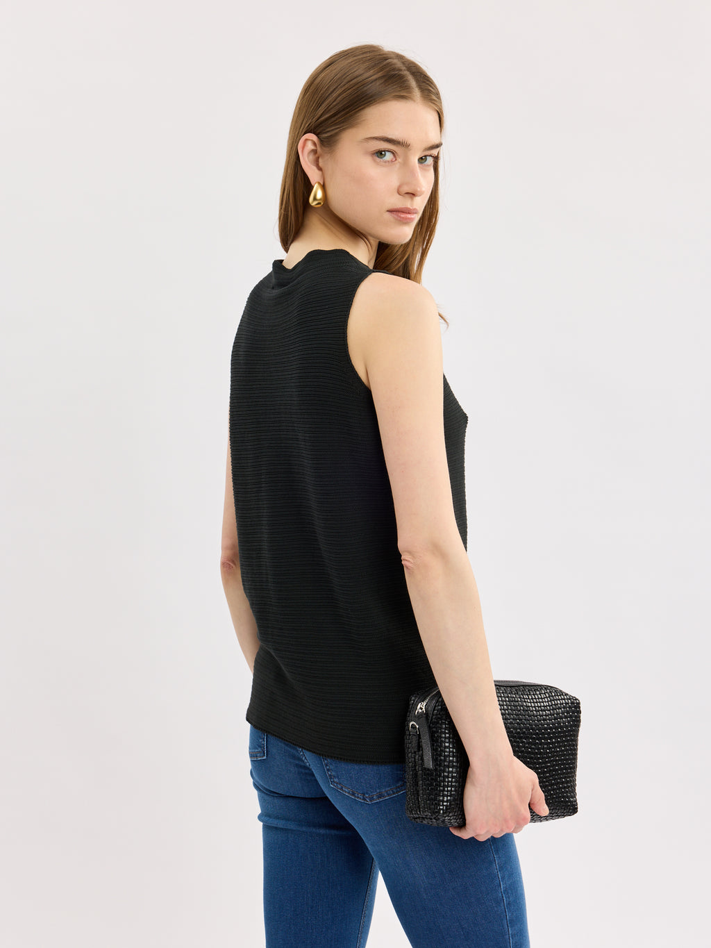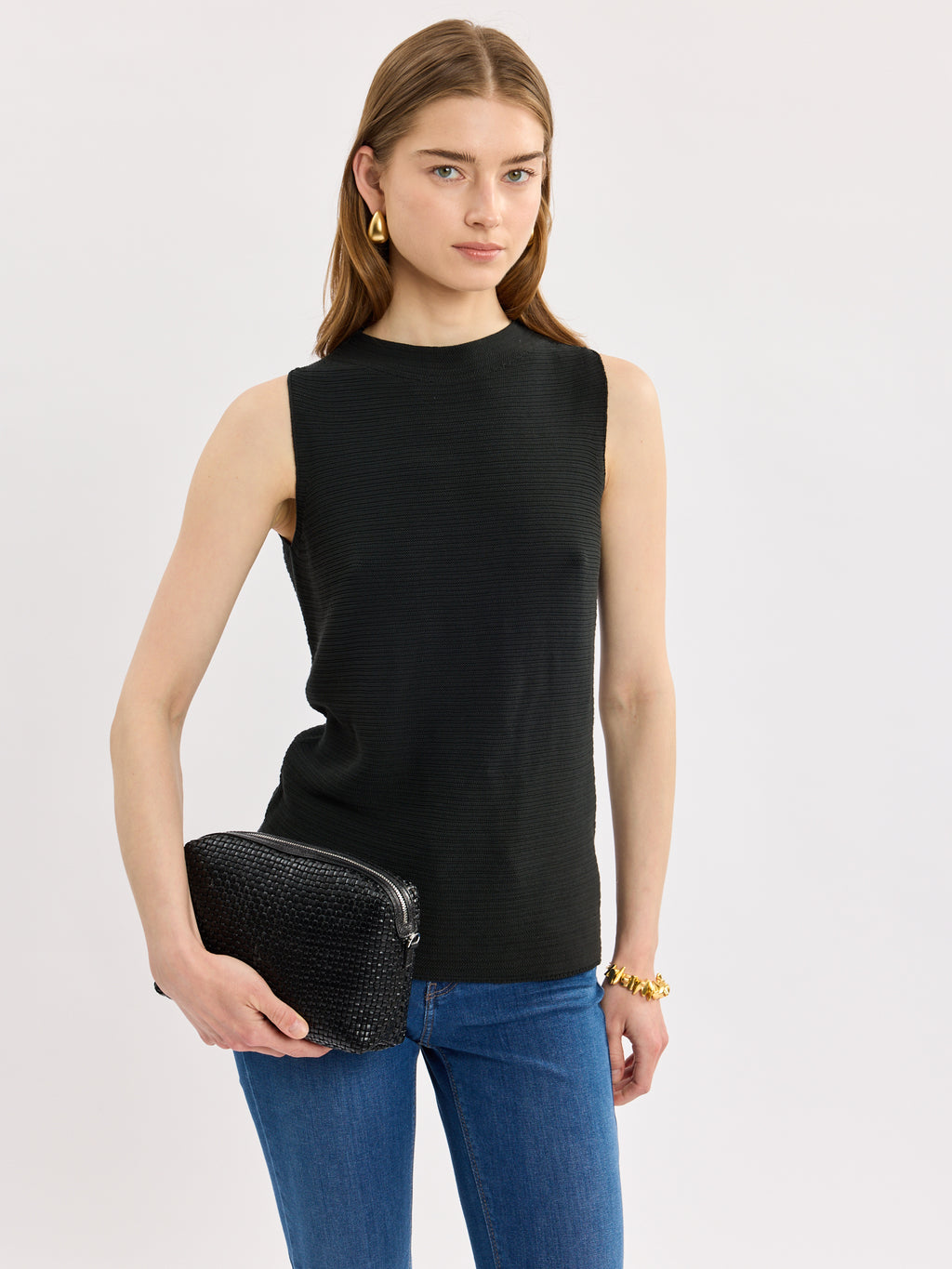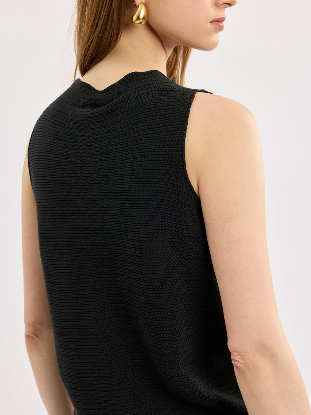 סריג ללא שרוולים עם צווארון גבוה מעט וקו כתפיים נקי, במרקם סרוג עדין שמוסיף עומק. הגזרה הישרה נופלת יפה על הגוף ומרגישה נעימה וקלילה, כך שהוא עובד מצוין כטופ סריג בפני עצמו או כשכבה מתחת לז׳קט מחויט או קרדיגן תואם. סריג אלגנטי שמתחבר בקלות למכנסיים מחויטים, ג׳ינס או חצאית מידי, למלתחה חכמה ומוקפדת.