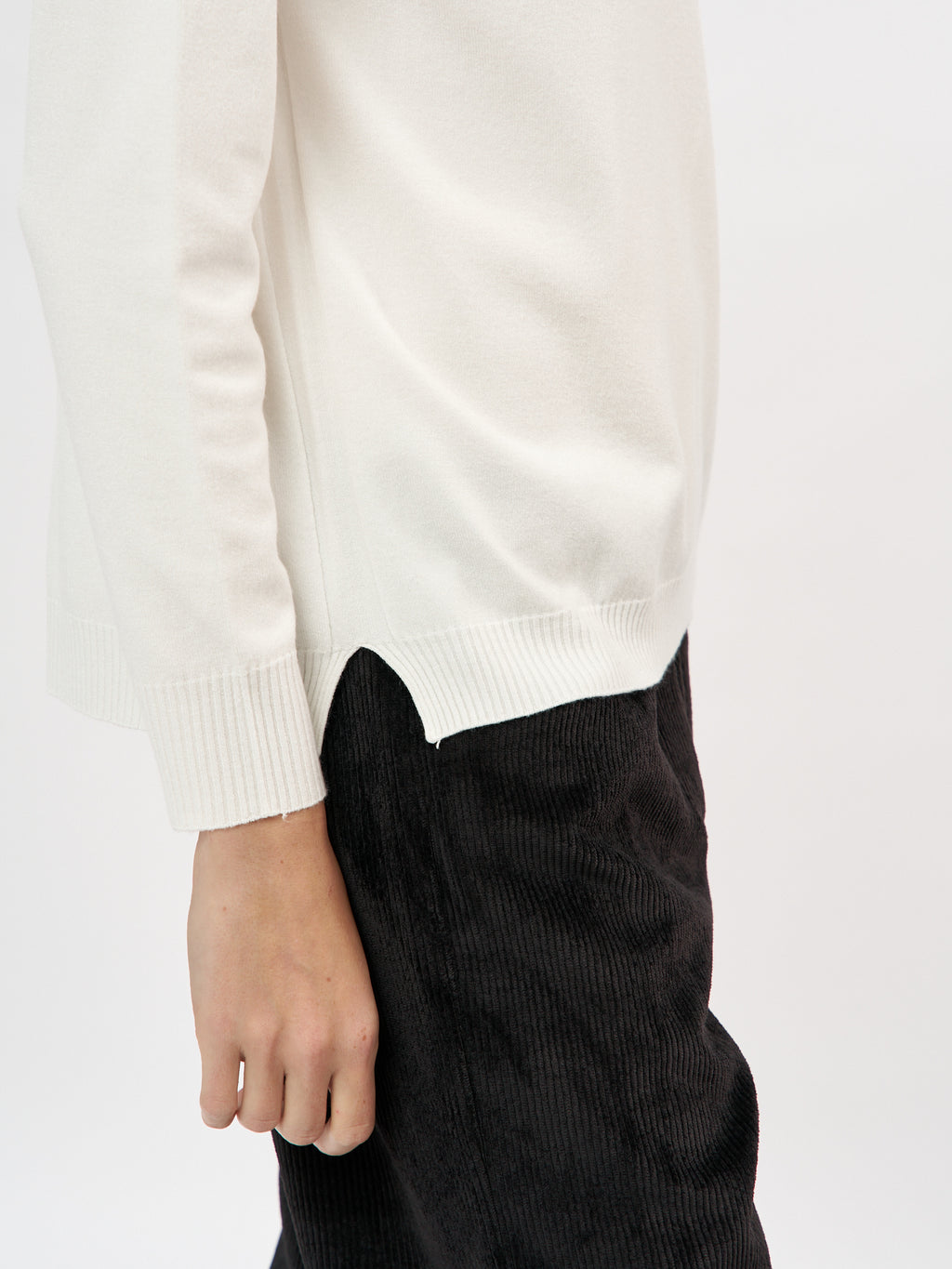הסריג כולל שרוולים ארוכים, סיומות צלעות עדינות ופתחים קטנים בצידי המכפלת – פרטים קטנים שמוסיפים עניין ותחכום למראה הפשוט.