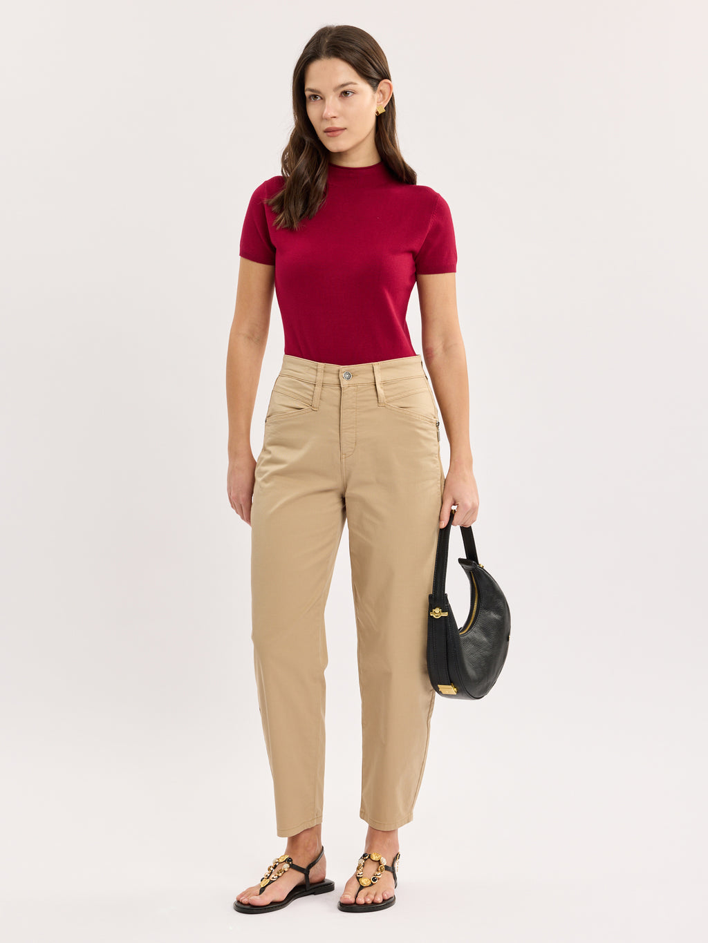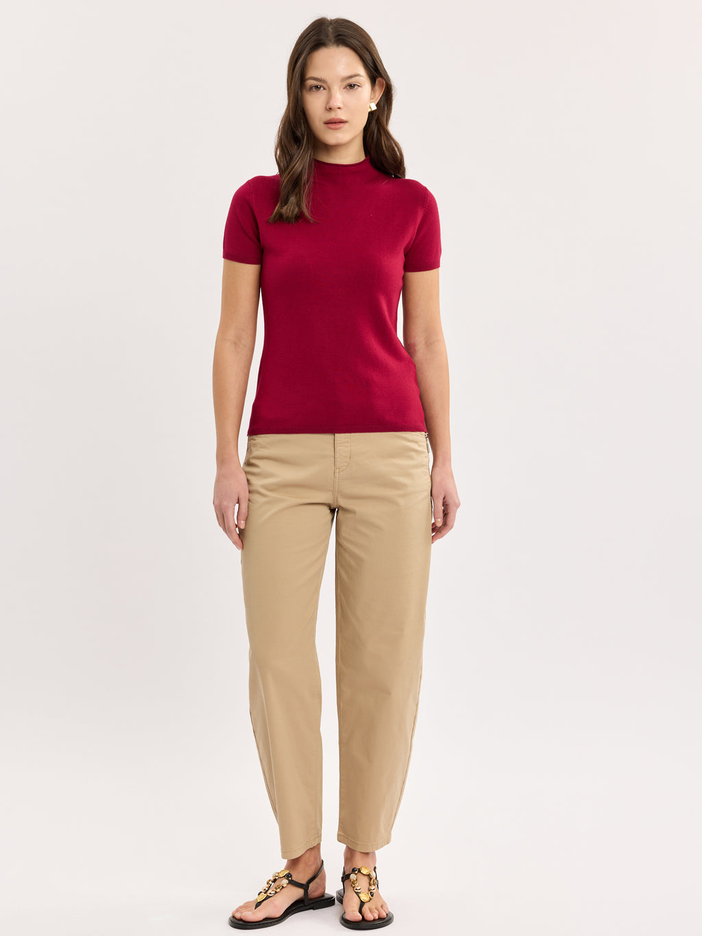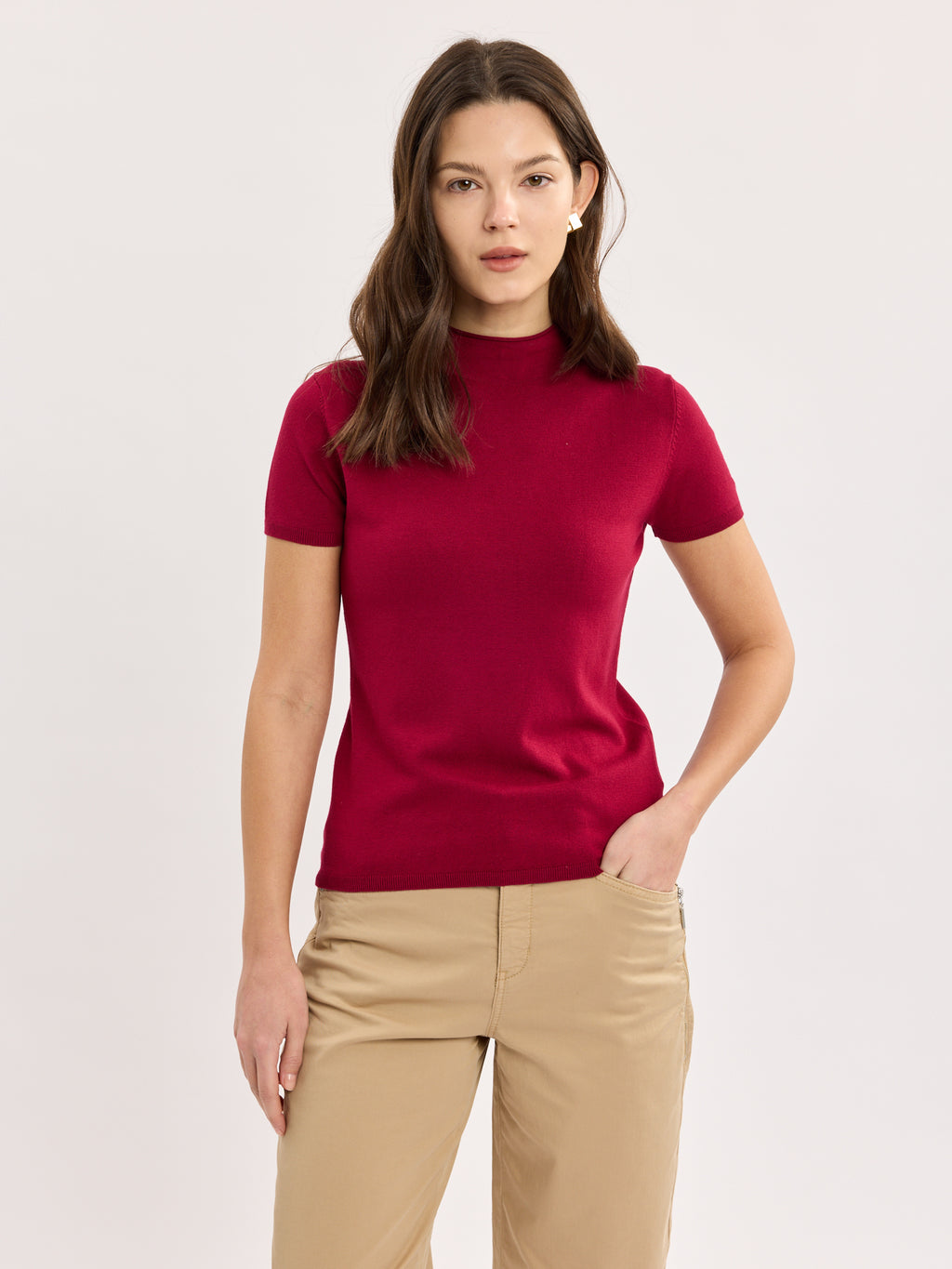 סריג אלגנטי בגזרה מחויטת, עם צווארון גבוה נקי ושרוול קצר. קל לשלב עם מכנסיים מחויטים או ג׳ינס נקי, לפריט שעובד היטב במלתחה חכמה. מגיע בצבעים שחור ודובדבן.