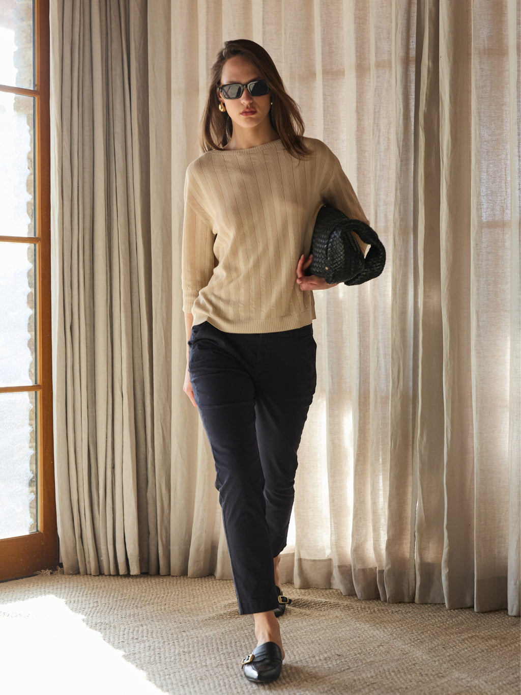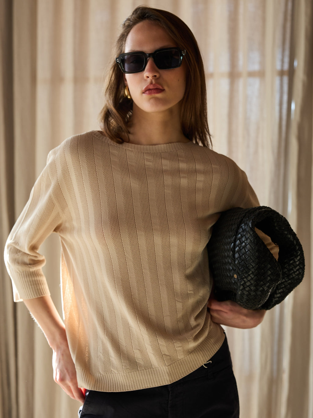 סריג קליל ומעודן עם טקסטורת פסים אנכיים שמאריכה ומחמיאה לגוף. הגזרה נקייה ונינוחה, עם צווארון סירה אלגנטי, שרוולים באורך 3/4 וסיומות ריב עדינות בשרוול ובשוליים - לוק מוקפד שמרגיש נעים ולא מתאמץ. מושלם ליום-יום עם ג’ינס או מכנס מחויט, וגם לערב כשמתחשק מראה אלגנטי ופשוט.