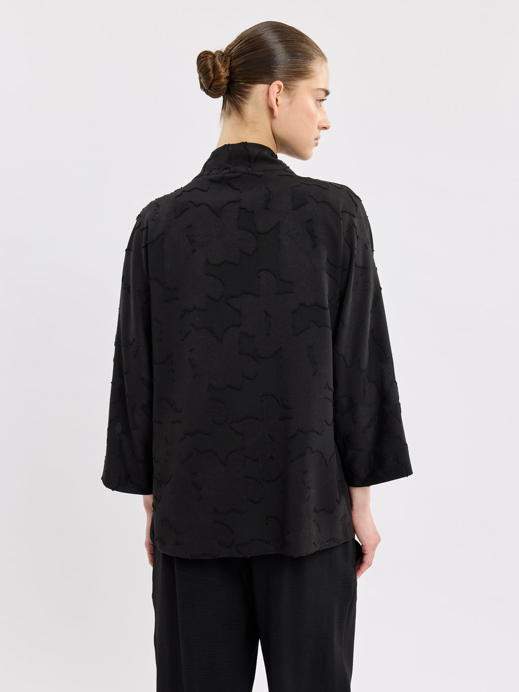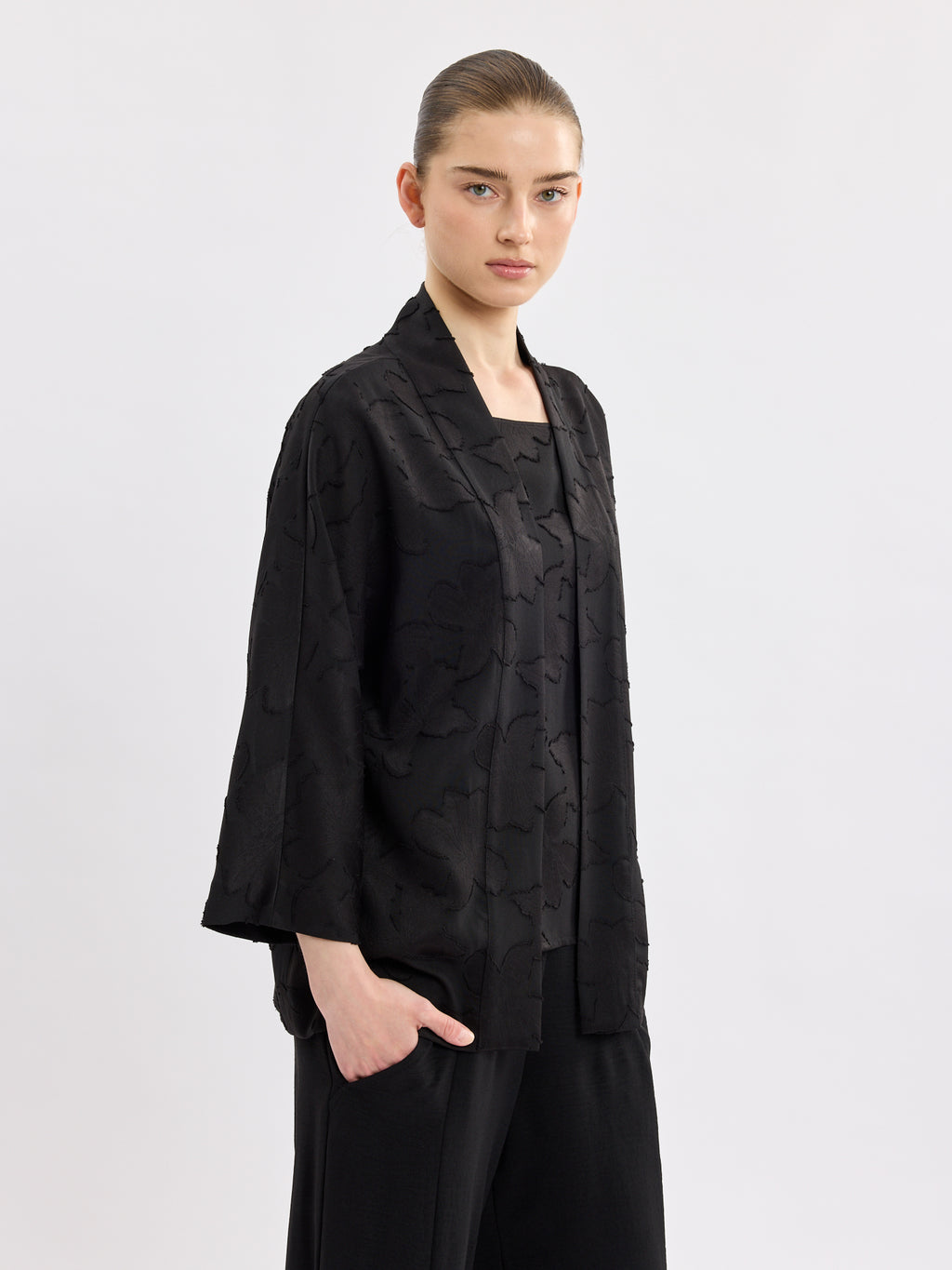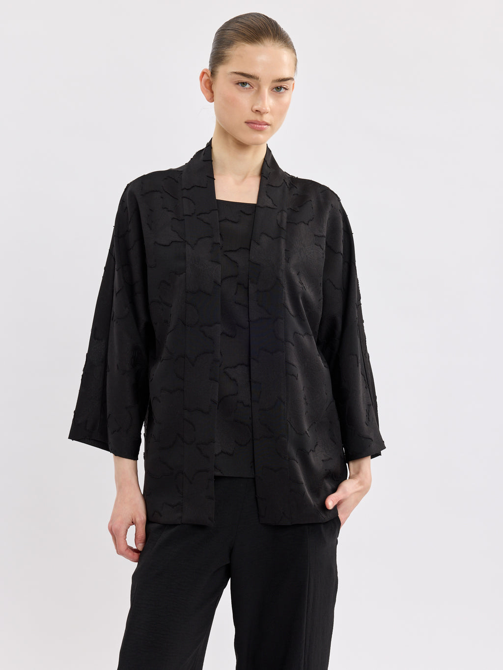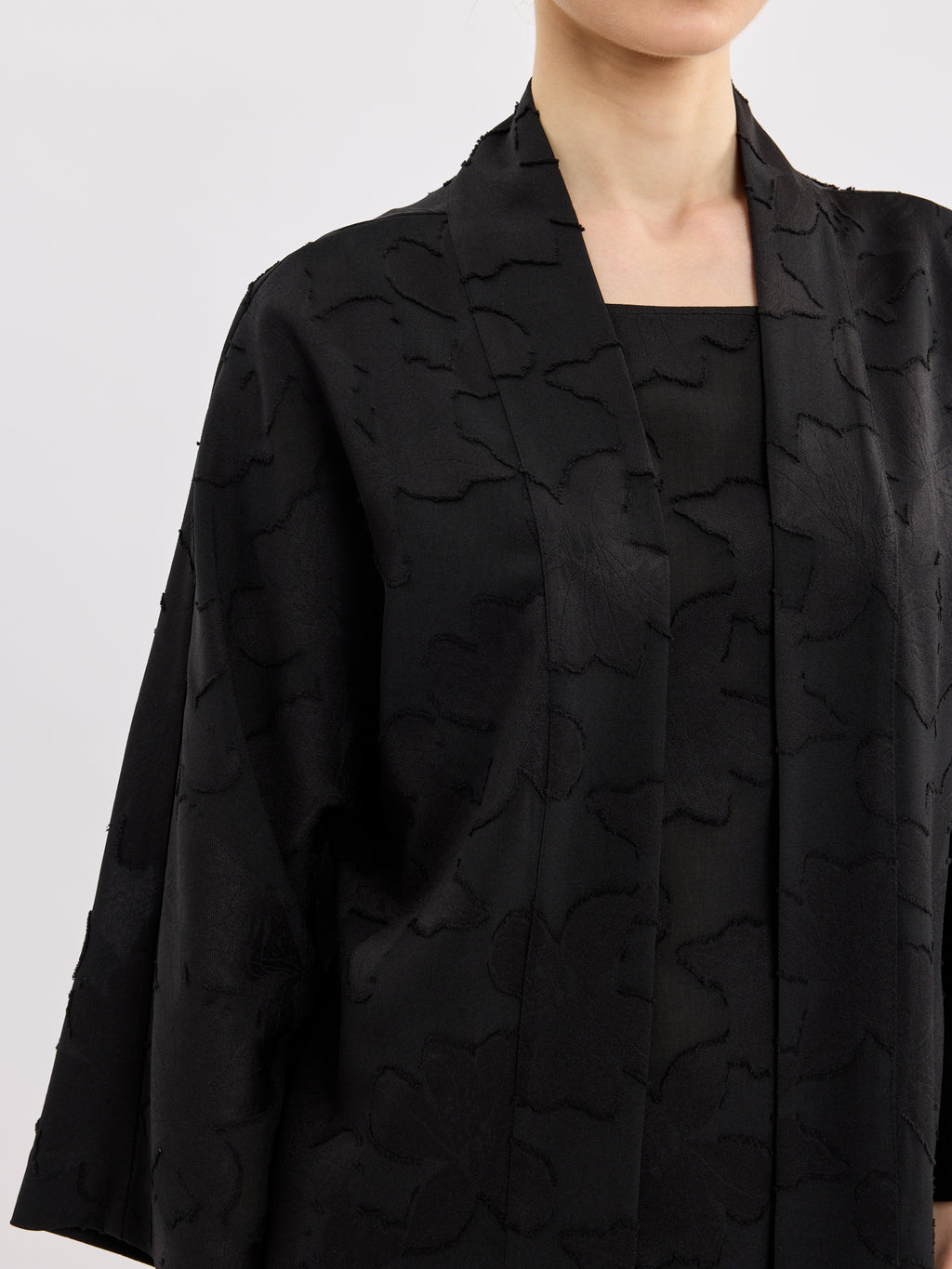 עליונית שחורה אלגנטית בגזרת קימונו פתוחה, עם דוגמת תבליט עדינה שמוסיפה עומק ומראה מוקפד. קו הצווארון הנקי והשרוולים באורך 3/4 יוצרים נוכחות קלאסית ונינוחה.