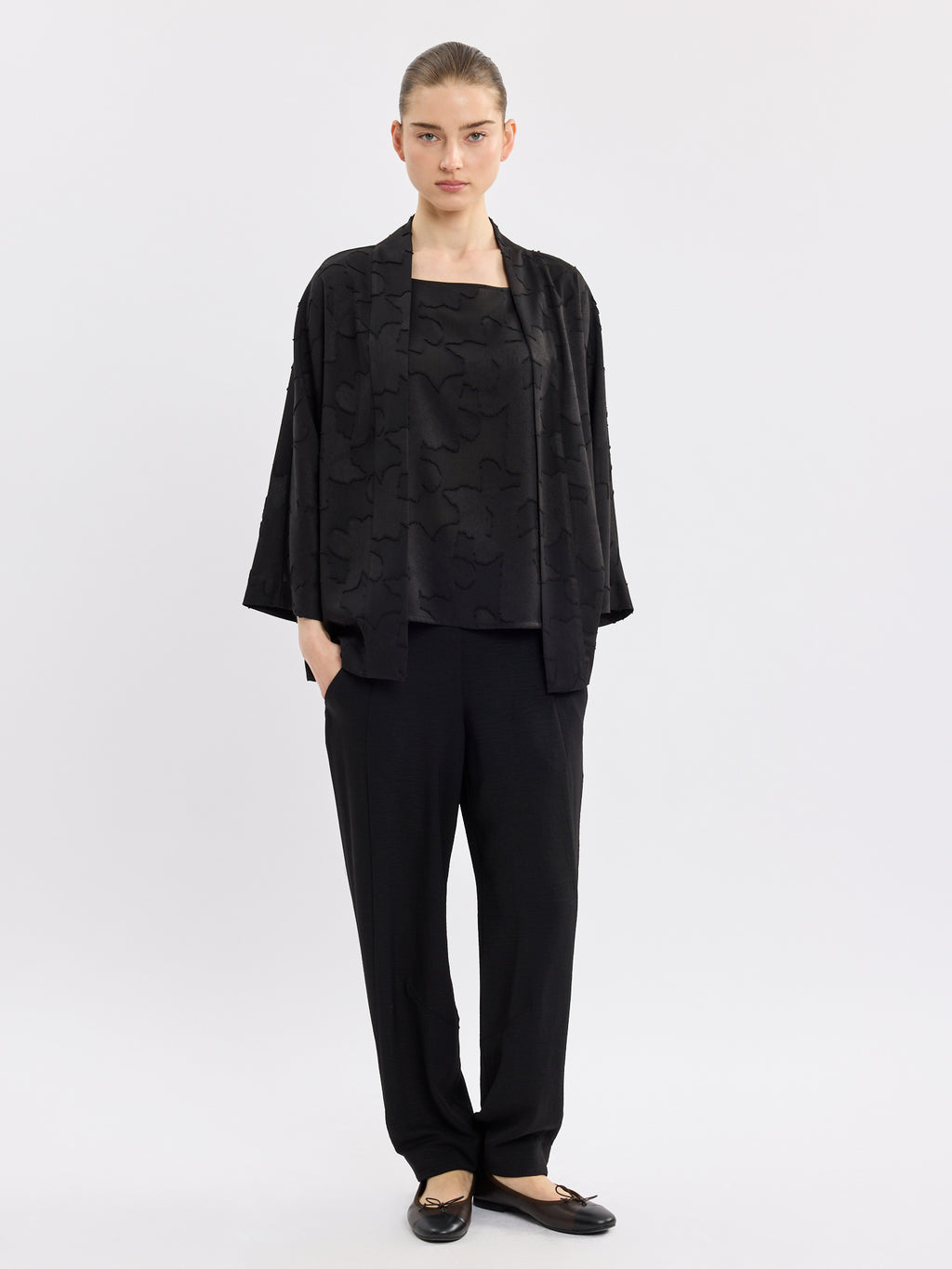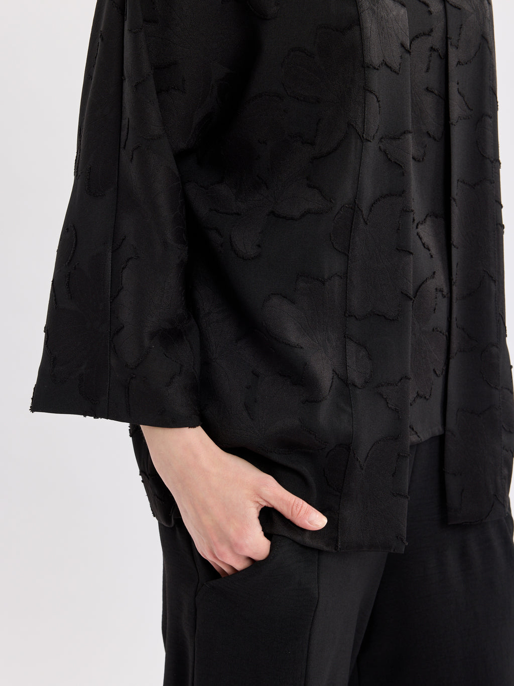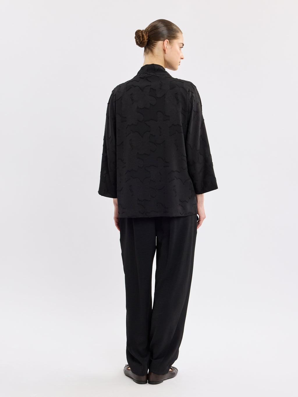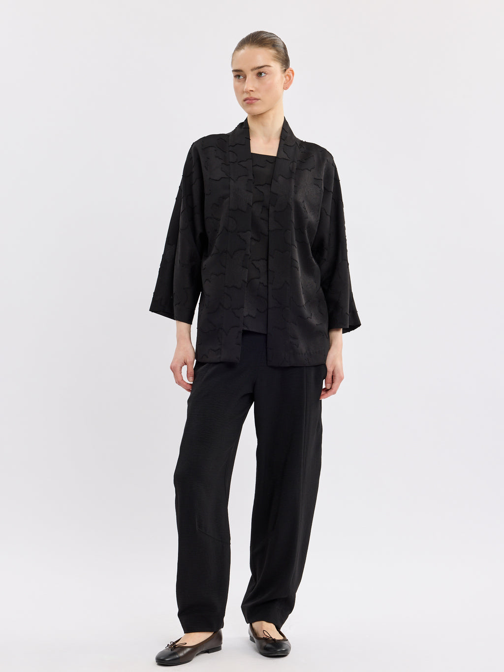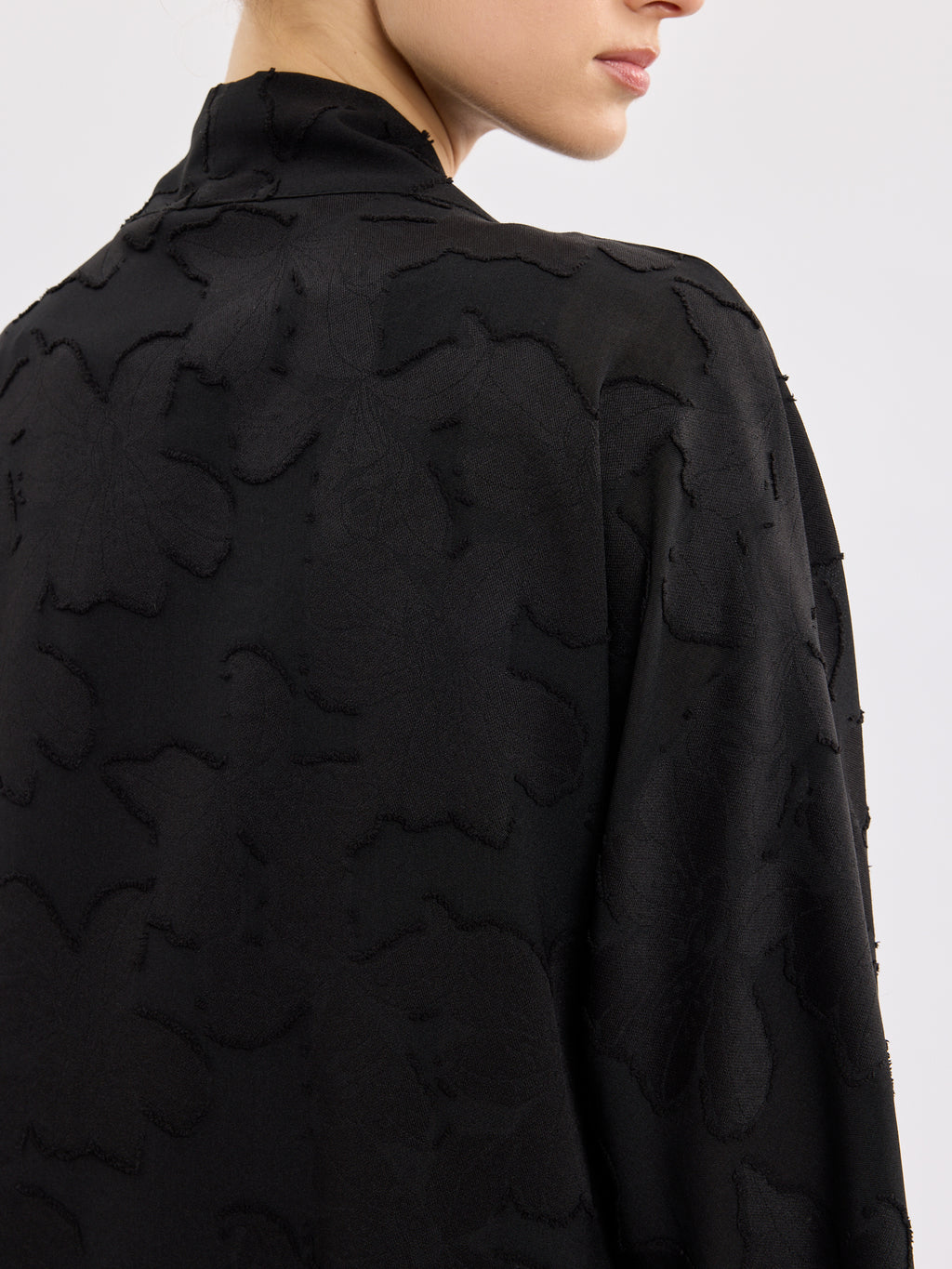 עליונית שחורה אלגנטית בגזרת קימונו פתוחה, עם דוגמת תבליט עדינה שמוסיפה עומק ומראה מוקפד. קו הצווארון הנקי והשרוולים באורך 3/4 יוצרים נוכחות קלאסית ונינוחה.