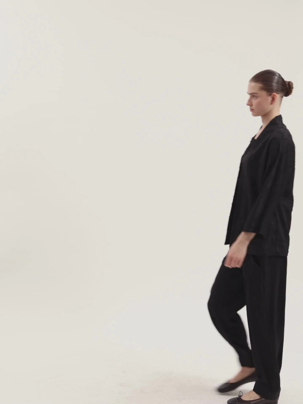 הגזרה הישרה והרחבה נופלת ברכות ומאפשרת שכבה קלה מעל חולצה או שמלה שחורה. עליונית אלגנטית המשתלבת בקלות בכל לוק.