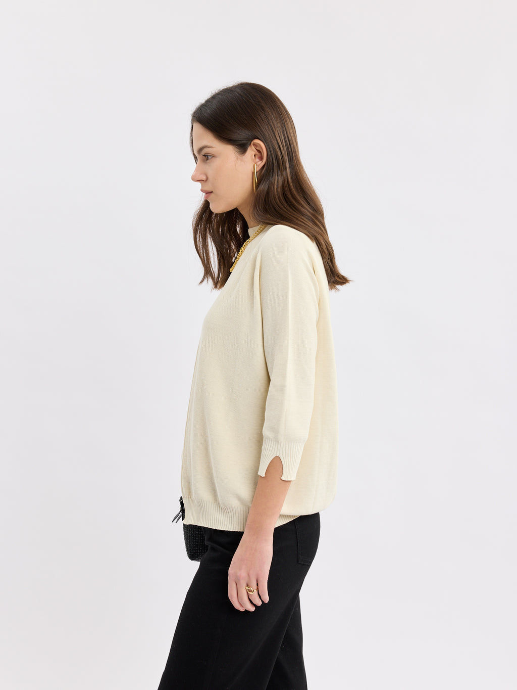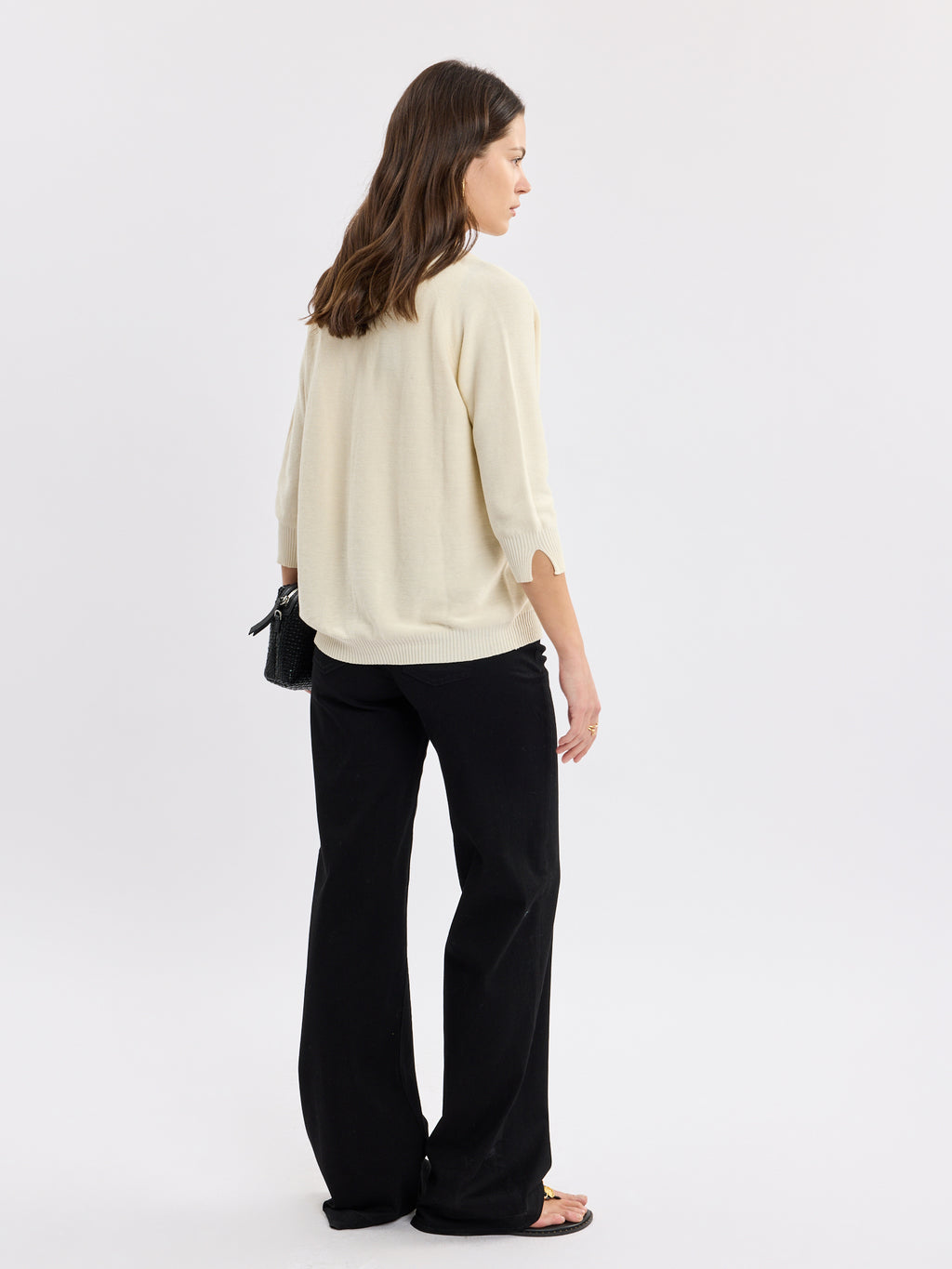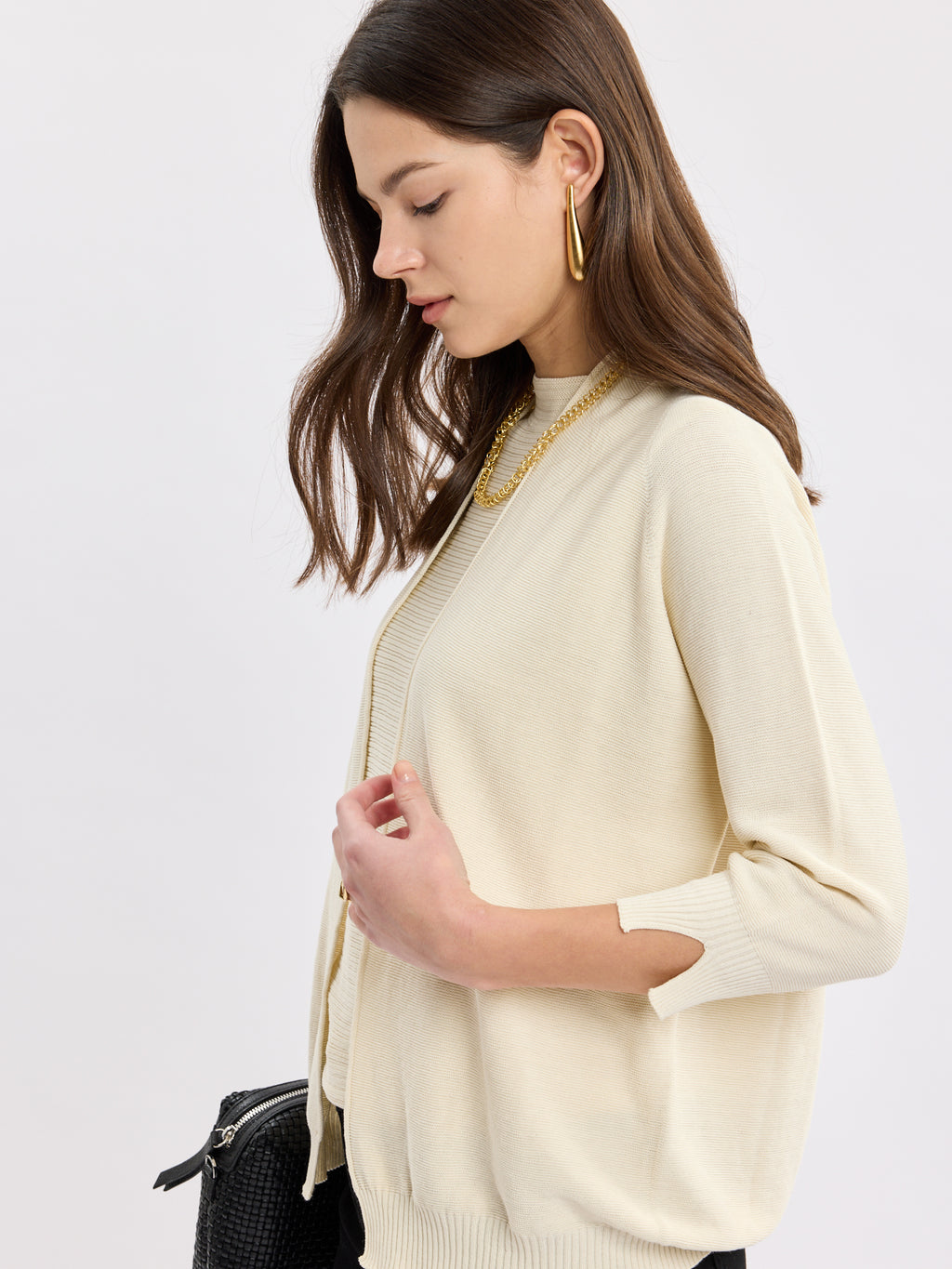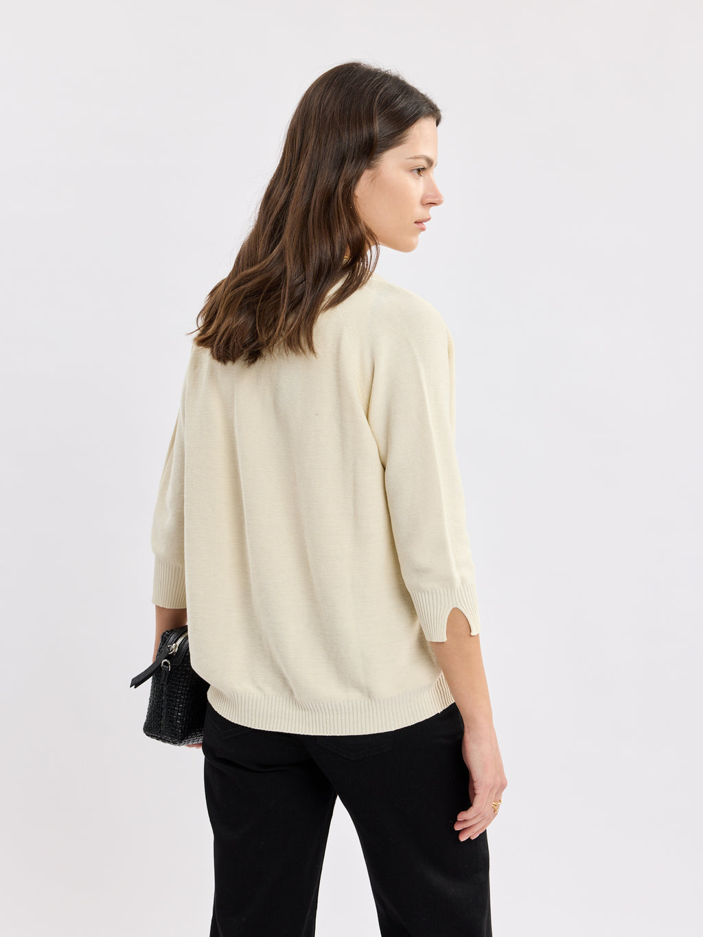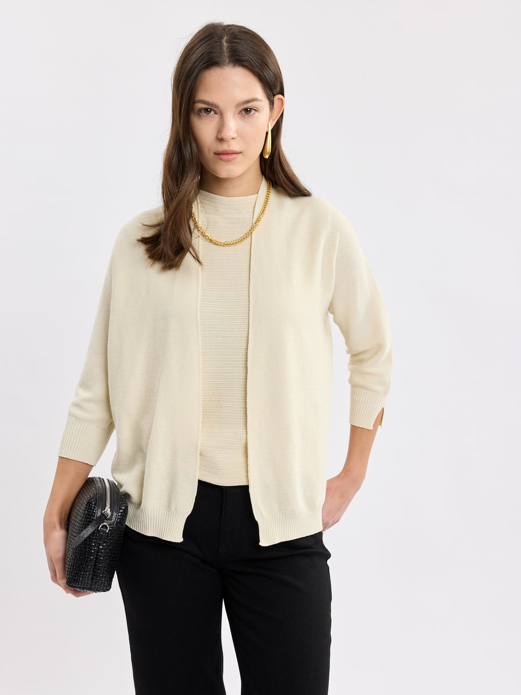 קרדיגן פתוח ונקי בגזרה רכה, עם קו חזית ישר וסיומות ריב עדינות בשוליים ובשרוולים. הנפילה קלילה ומחמיאה, והשרוולים באורך 3/4 עם שסע קטן במכפלת מעניקים נוחות ואלגנטיות לא מתאמצת. זה קרדיגן נשים שמסיים כל לוק בשקט, מעל טופ, שמלה או סריג, ונשאר מוקפד לאורך היום.
