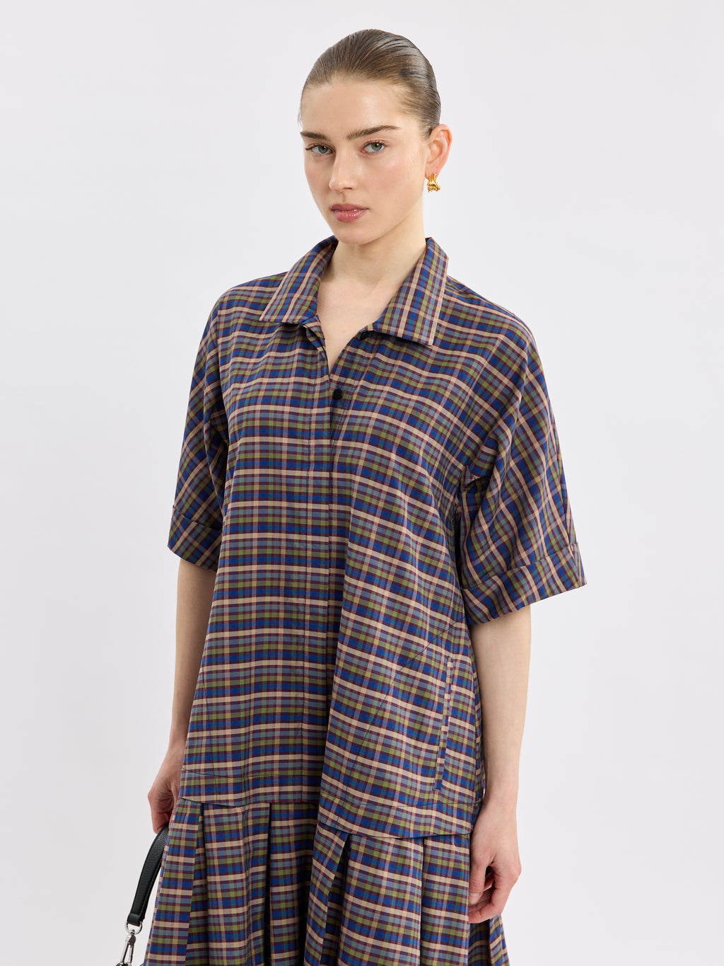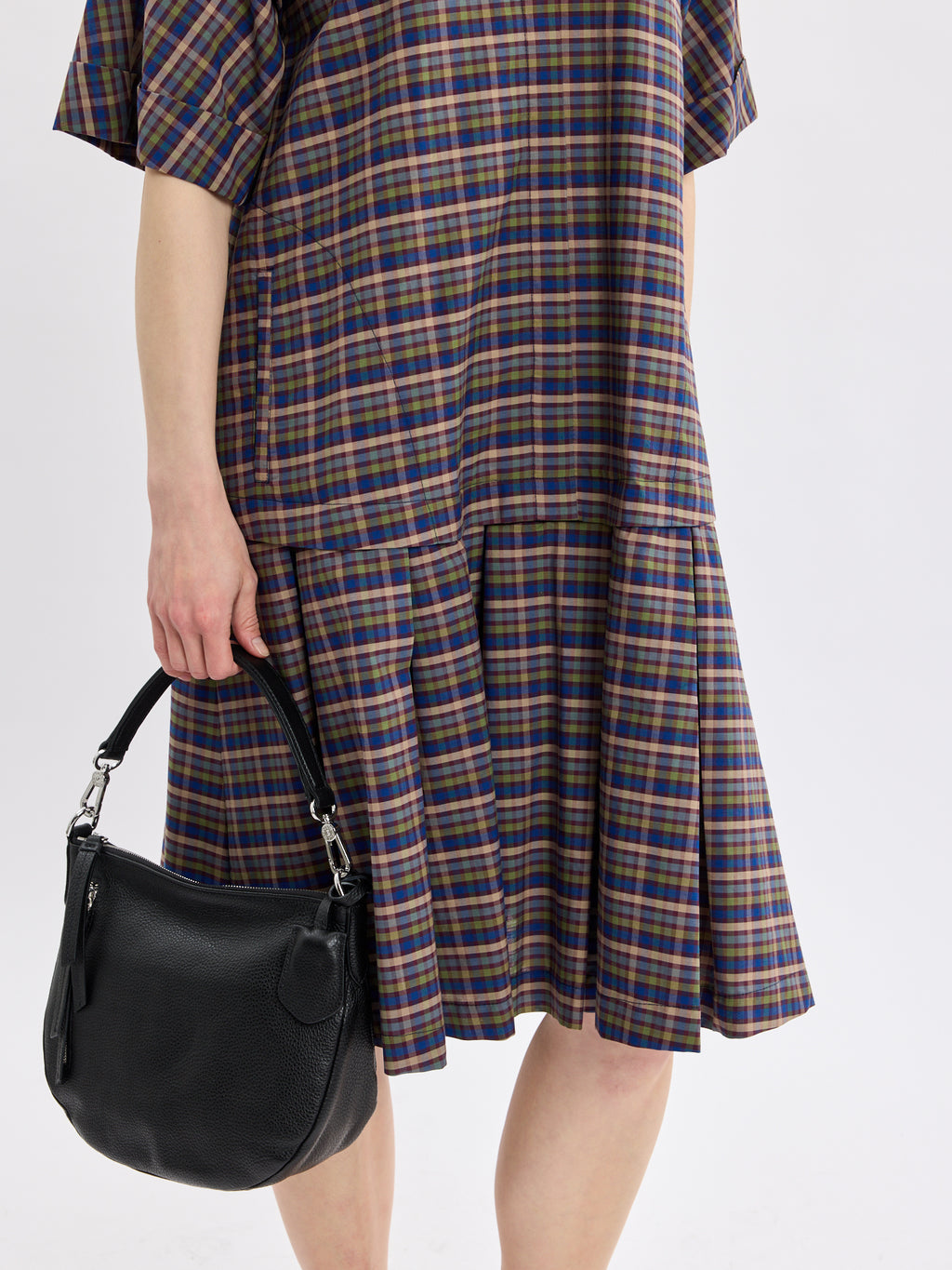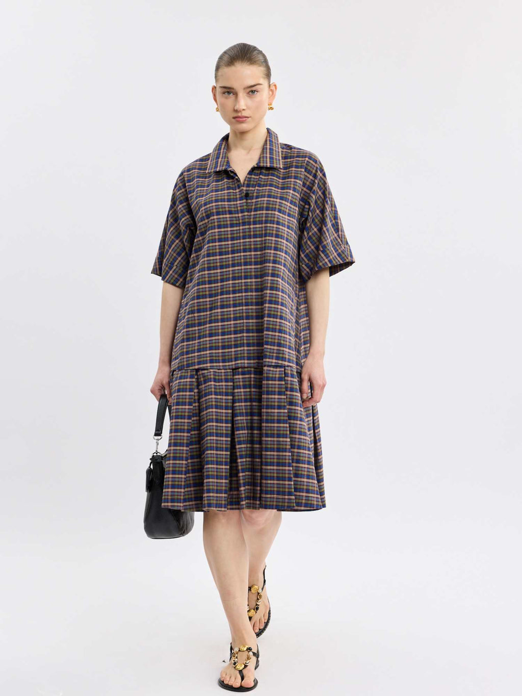 שמלת מידי עם צווארון ופתיחה מכופתרת, בגזרה נינוחה ומוקפדת שמרגישה אלגנטית בלי מאמץ. מגיעה בשחור קלאסי או בדגם משבצות עדין שמוסיף עניין מדויק.