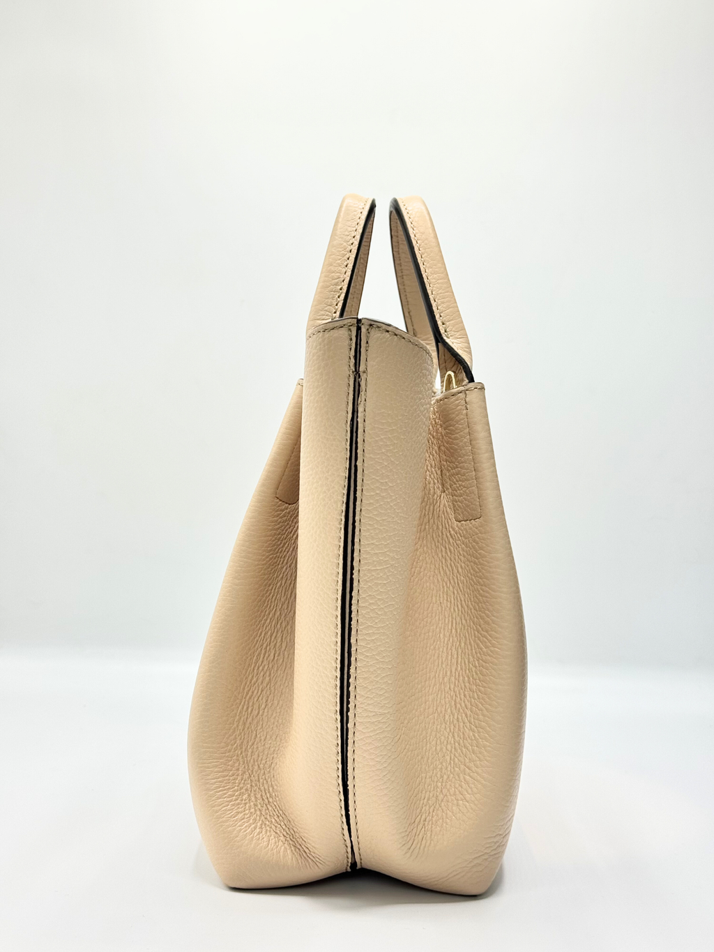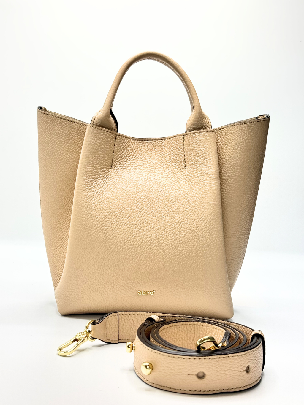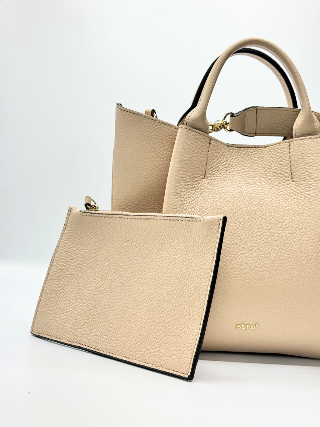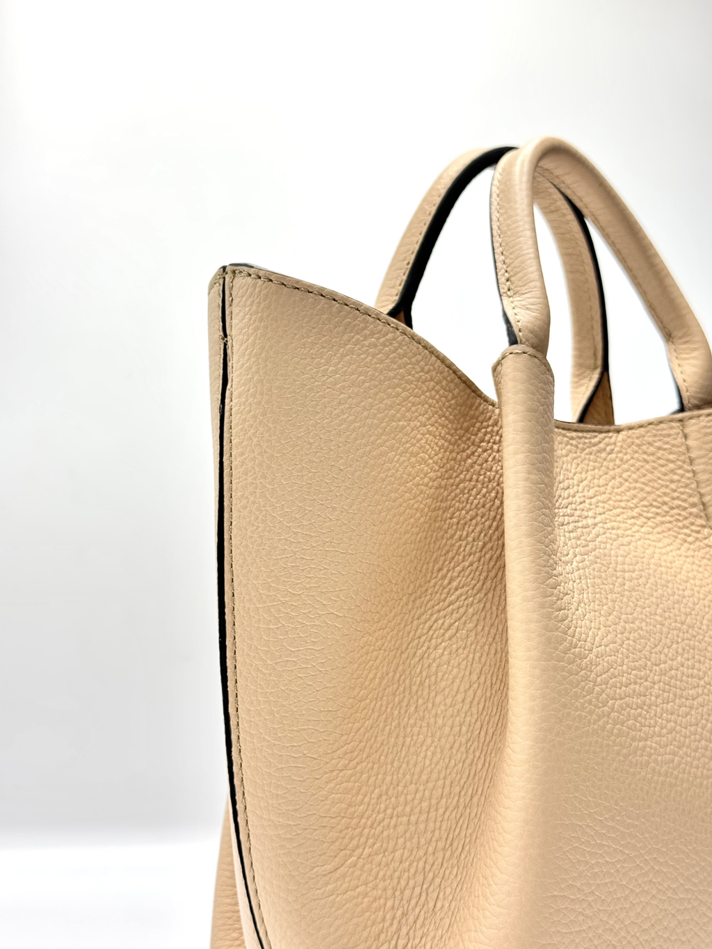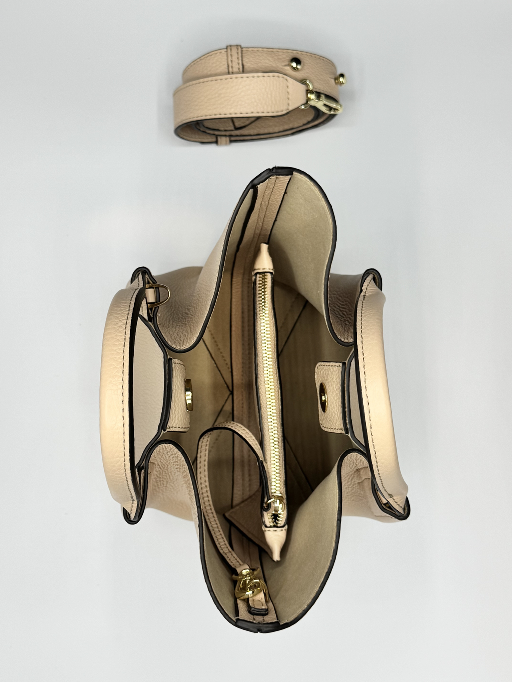 תיק עשוי עור איטלקי, עם תא מרכזי הנסגר במגנט ועיצוב נקי ומוקפד. מצורף פאוץ׳ פנימי נשלף לשמירה מסודרת על פריטים קטנים, ורצועת עור נוספת נשלפת ומתכווננת לנשיאה נוחה על הכתף.