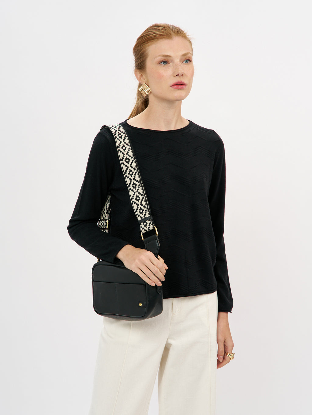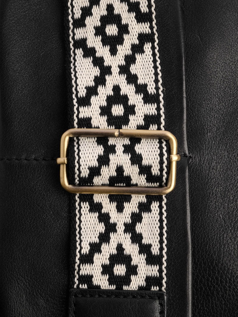 לתיק רצועת כתף רחבה עם דוגמת גיאומטרית בשחור-לבן, הניתנת להסרה – כך שניתן לשאת אותו גם כקלאץ’ אלגנטי לערב.