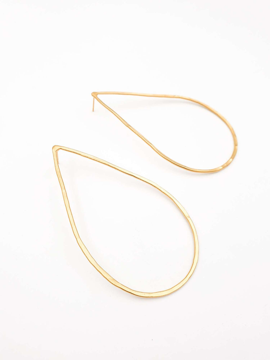עגילים צמודים ענקיים מלאי נוכחות בצורת טיפה חלולה גדולה . עשויים בעבודת יד בטקסטורה מרוקעת ובציפוי איכותי של זהב 24 קראט. הפריט מגיע עם אחריות לשנה.