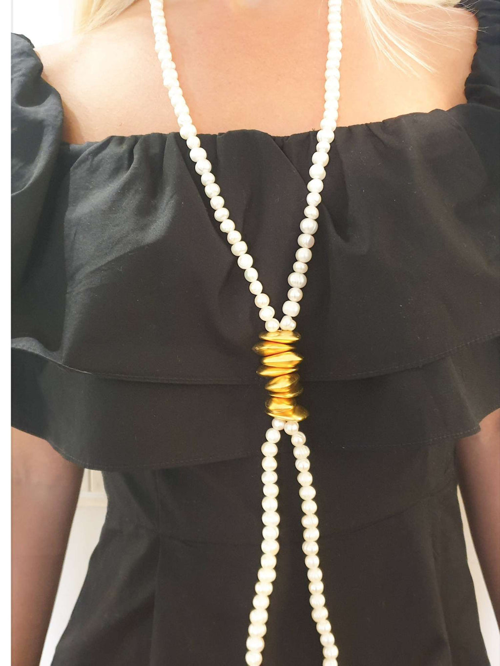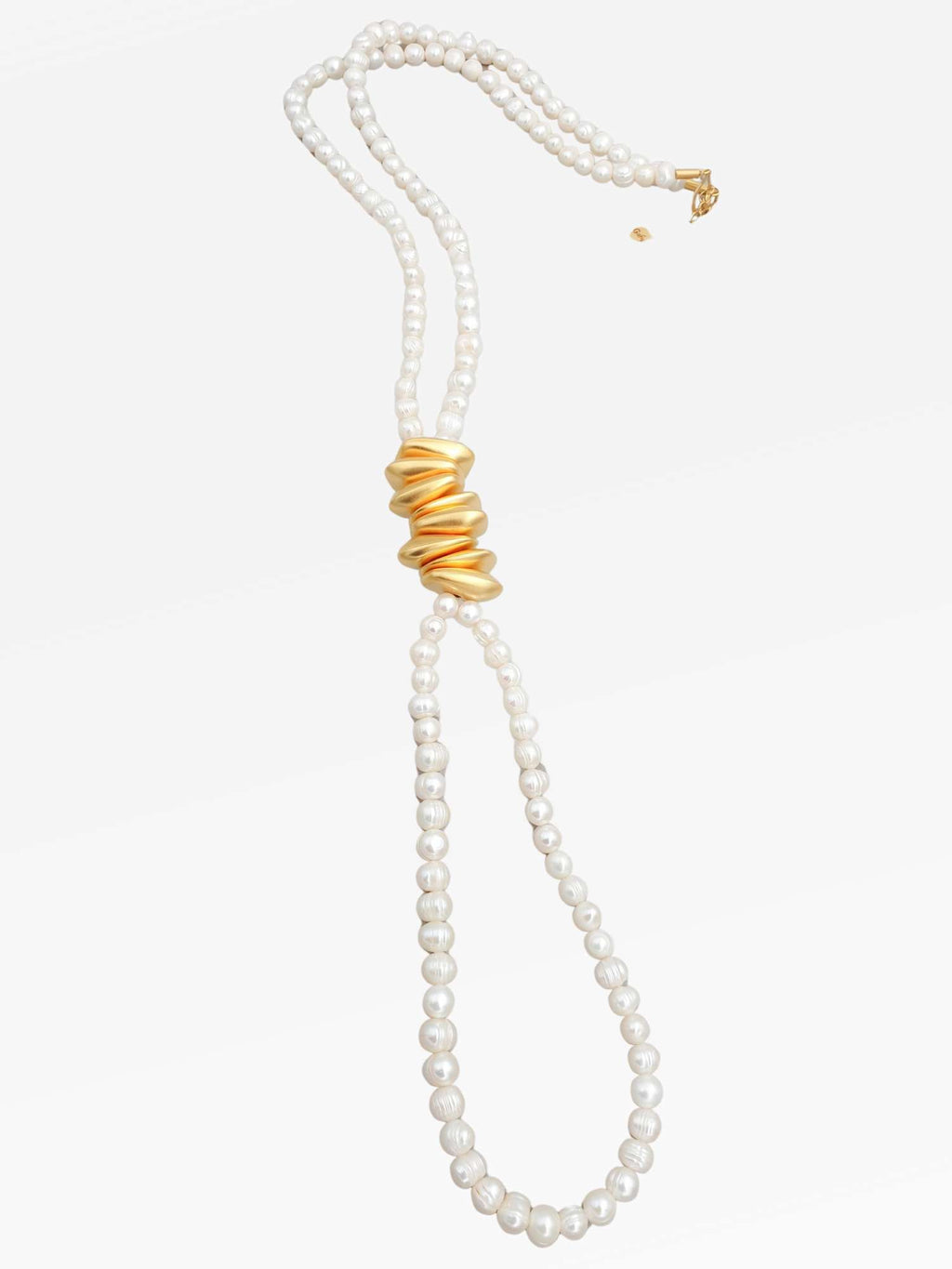 מחרוזת פנינים אמיתיות שזורה בצורת עניבה ובשילוב אלמנטים א-סימטריים בציפוי איכותי של זהב 24 קראט. הפריט מגיע עם אחריות לשנה.