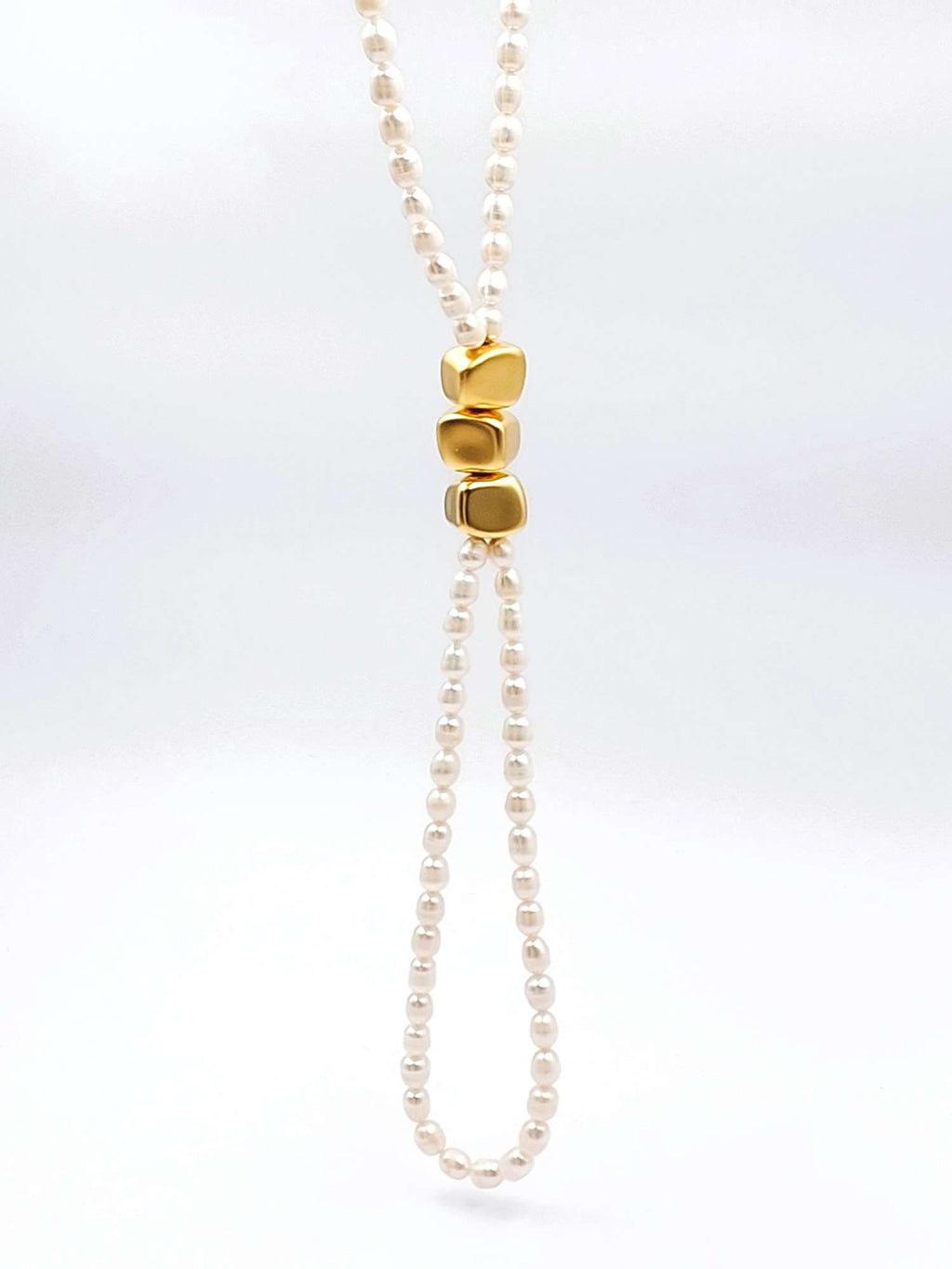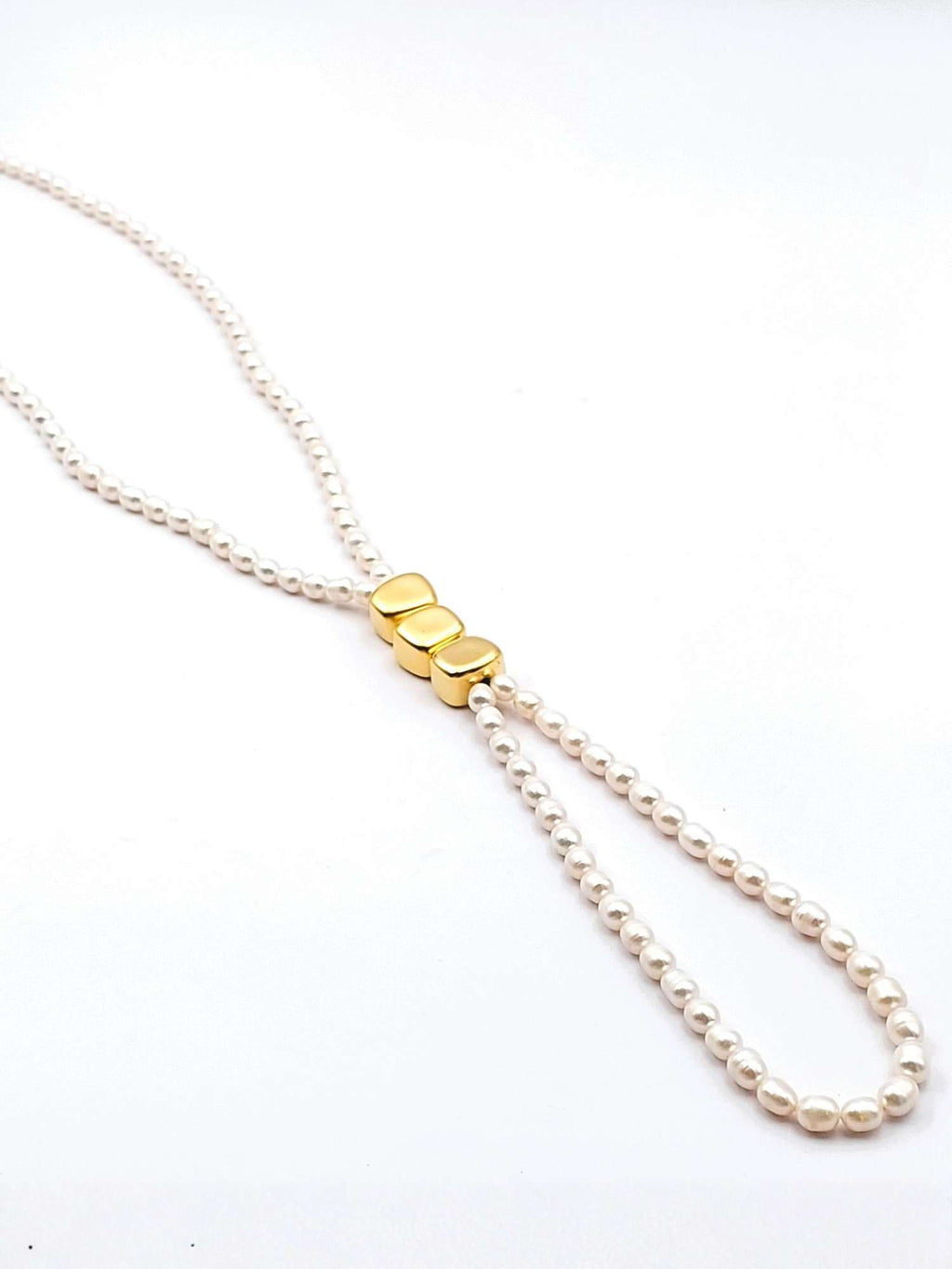מחרוזת פנינים אמיתיות שזורה בצורת עניבה ובשילוב אלמנטים בצורת קוביות א-סימטריות בציפוי איכותי של זהב 24 קראט. הפריט מגיע עם אחריות לשנה.
